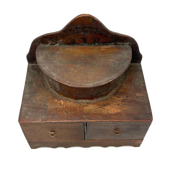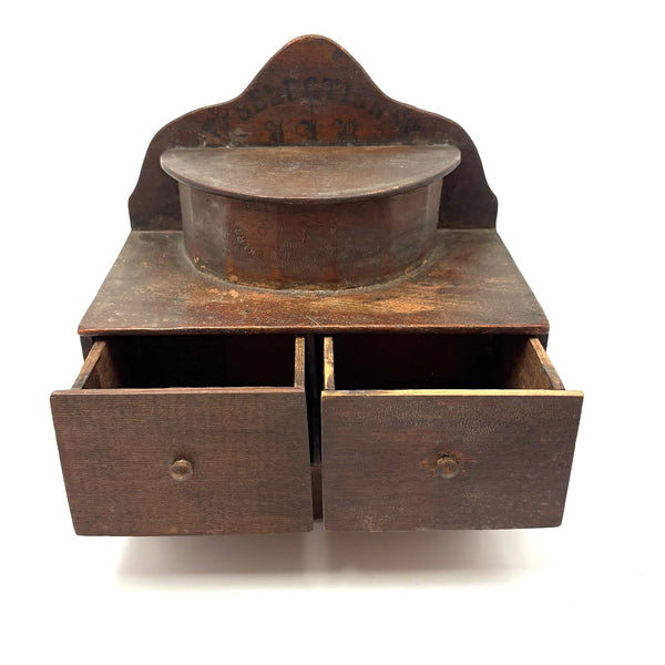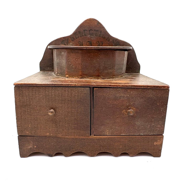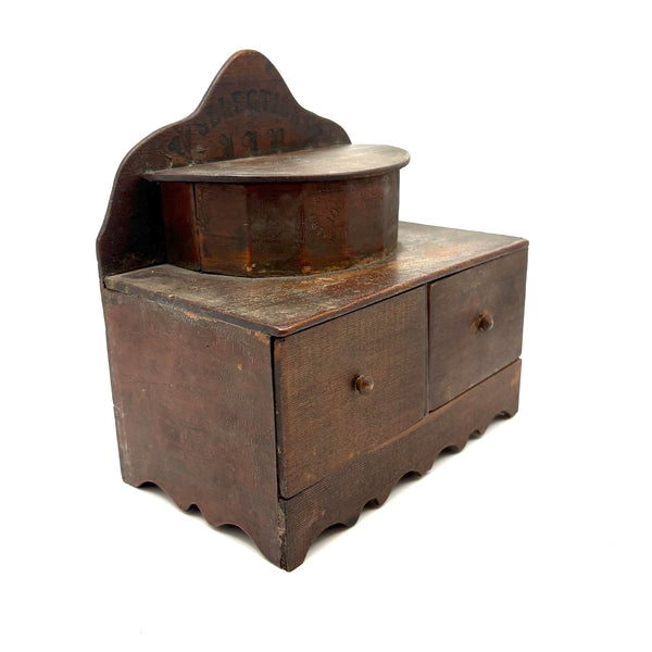 Based in the cigar box wood from which it was very lovingly constructed, I believe this little chest dates to the late 19th century, and I find it a complete charmer of a thing--with "Selection" arching across the top, terrific faceted form to the top compartment, which opens to reveal cloth hinges to either side of an ivy vine. Two drawers below with original wooden handles, and scalloped edges along the bottom. Feels Shaker meets tramp art to me, super sweet.