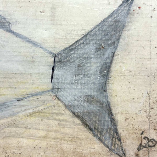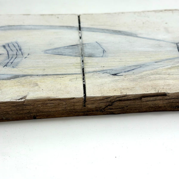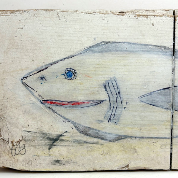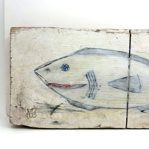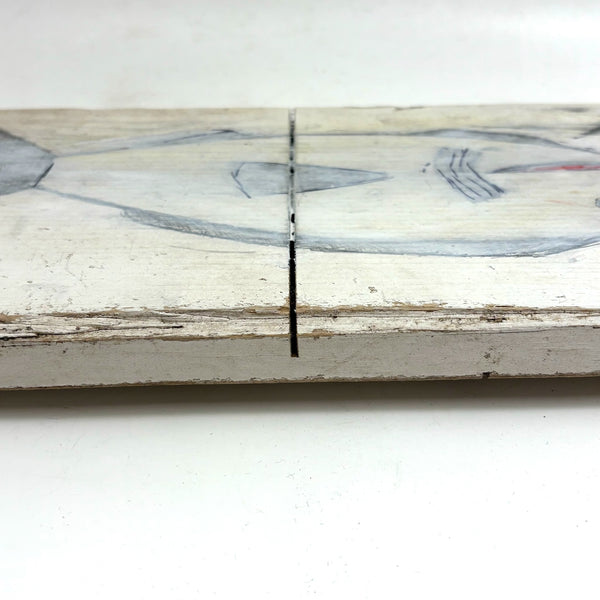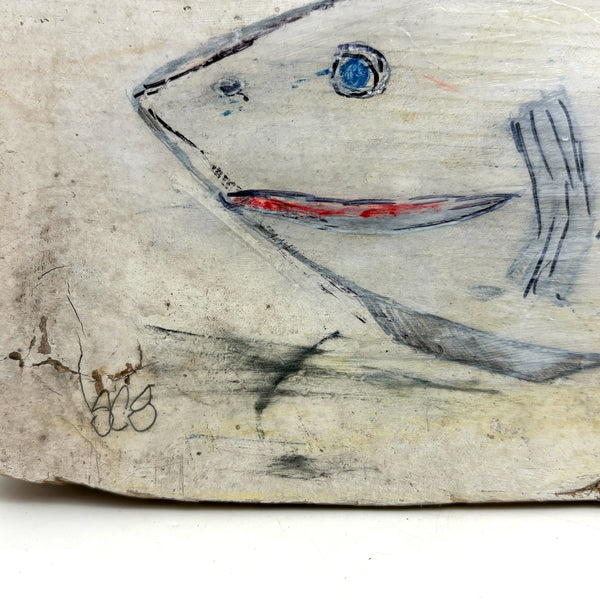 I don't believe this is very old--I presume the '20 at bottom right means 2020--but I think it is very excellent! And perhaps it is meant to portray some other sort of fish, but it sure looks like a shark to me. The old scrap wood panel used had an incision right down the middle--which has the effect of foreshadowing the cleaving of this Jaws in half --which for someone like me who has a deep fear of sharks, feels most welcome! I love this thing.