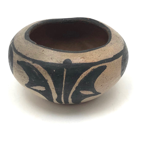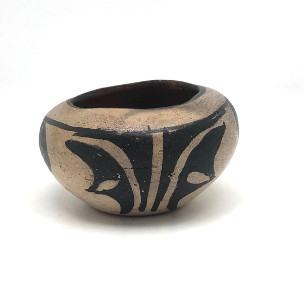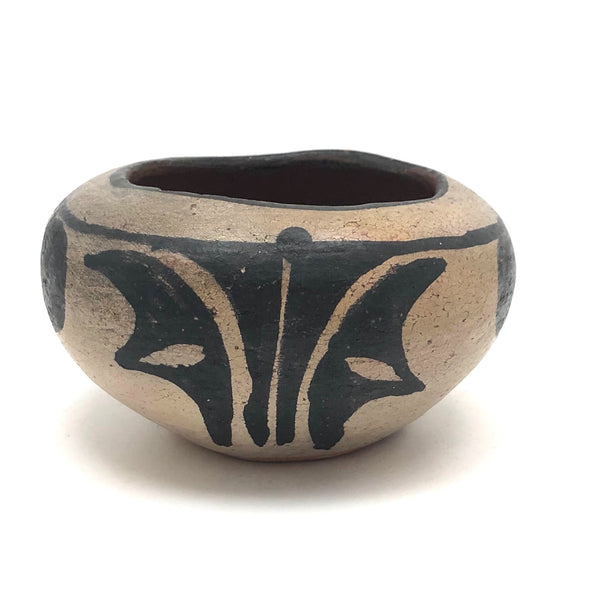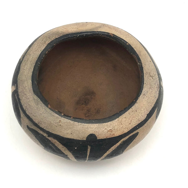 Little but lovely, I believe this old Native American Pueblo bowl is most likely Santo Domingo, one of the largest of the northern pueblos, located between Santa Fe and Albuquerque. Coil made, with super black hand-painted design over cream slip, with the pattern repeated twice around the perimeter. I would think not older than the 1940s but am not an expert.