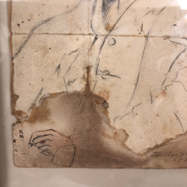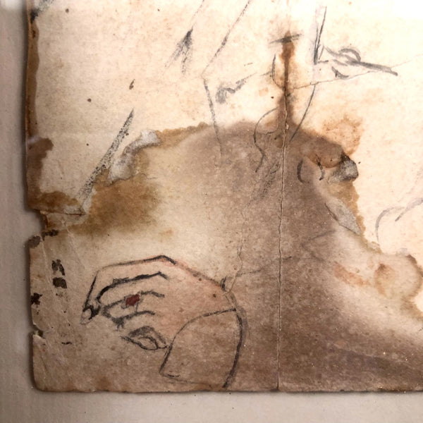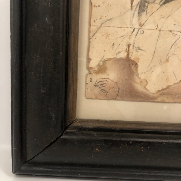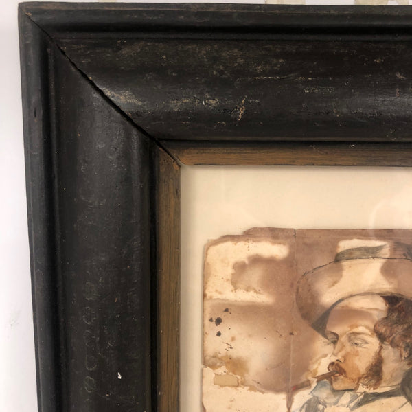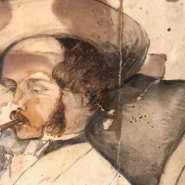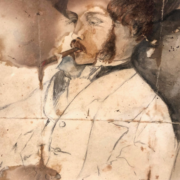 A terrific late 19th c. watercolor portrait, of a manner that makes me think of Manet or John Singer Sargent, etc, with an equivalent sort of confidence and sense of ease about it. It appears to be signed John Henry Sylvester at the bottom and dated what looks to be 1896 (?)--which points perhaps to the British artist of the same name, active in the last few decades of the 19th c. and by whom there is one portrait in the National Portrait Gallery in London--but the sensibility is quite different so I am skeptical. Whatever the case, clearly it was painted by an artist who knew what they were doing, with a great deal of character and attitude conveyed with immediacy. Personally, I love that it appears to have been folded in sixths, carried around, and much toned/stained over the years, a history that I think melds with the drawing itself in a really wonderful way, making for an even richer portrait.