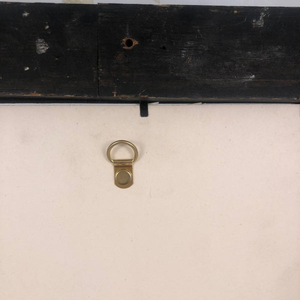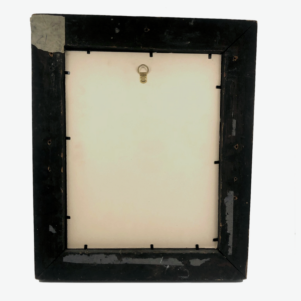 Framed, behind glass: 15 9/16" x 12 3/4". Watercolor itself measures @ 8" x 6 1/2". Toning, folds and one small hole as documented, which to my eye just enhance it. In a heavy, roughly period frame, into which I believe it was fairly recently placed, with clean, new backing. There are holes in the back of the frame for wiring and hanging.