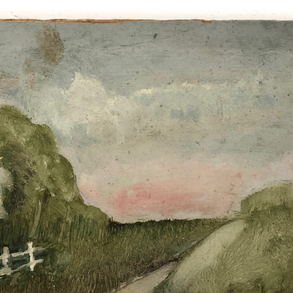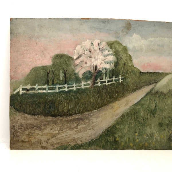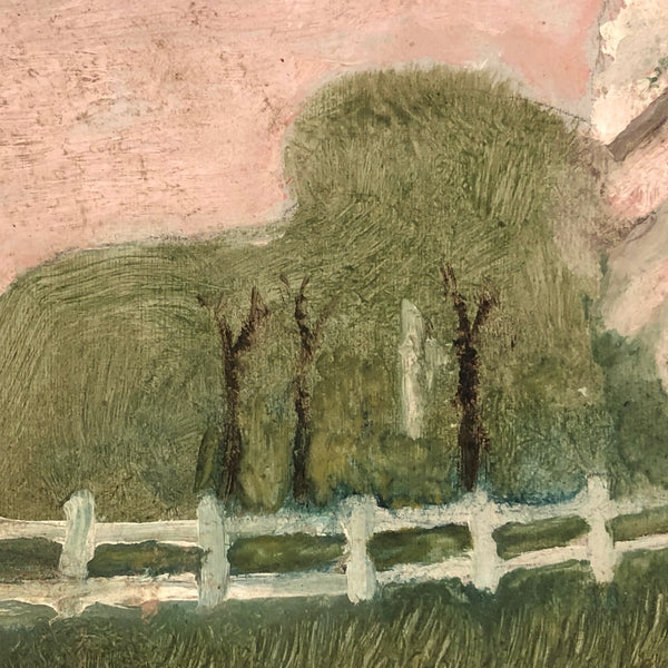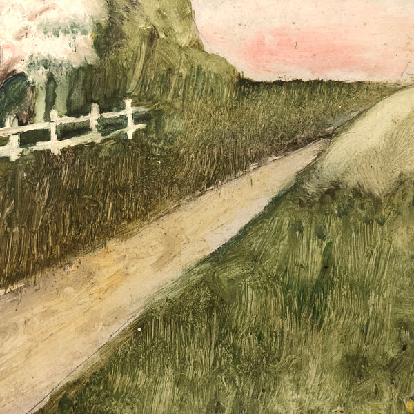 I found this one at the flea market just this morning and just really love the softness and dreaminess of it (and amid a long drought here, its Spring-y greenness really appeals!) My guess is it might be a hilltop cemetery perched behind the white fence, with the blooming pink tree in front and what look like weeping willows behind, together with the path leading into the distance, giving the painting a sense of portraying the endless cycle of death and rebirth. Humble but rather luminous.
