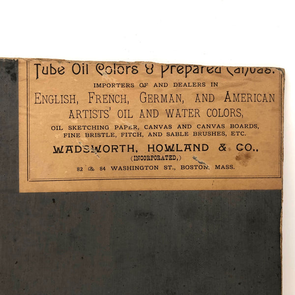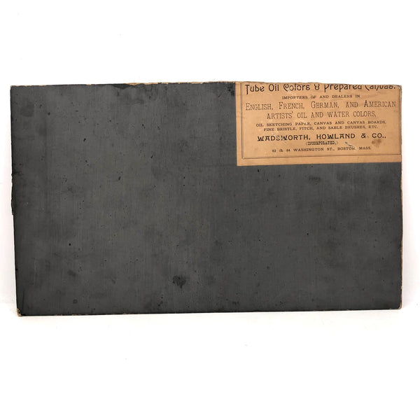 11 7/16" x 6 3/4" and in good condition; slightly arching along the top edge as it was cut down from a larger canvas, I would think prior to its painting. The label on the board is Wadsworth Howland and Co. Boston, dating it to the late 19th c. Unsigned.