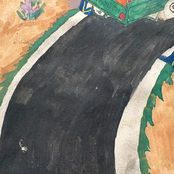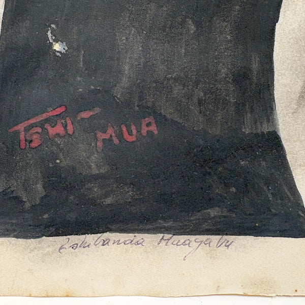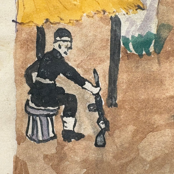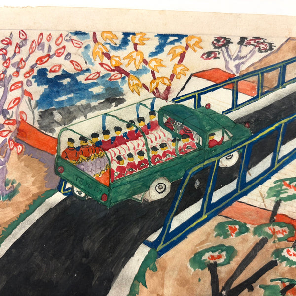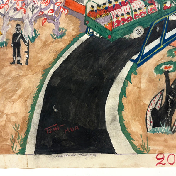 I purchased this and a second watercolor by the same person at Brimfield, them immediately liberated them from old mats and frames upon returning home in order to really see them; they needed to see the light of day! (All they need now is to float against white in a very simple, clean, white or black frame.) This one is signed, twice-- Tshi Mua and Tshibanda Muayabu--I believe most likely Congolese, and if so my guess is painted toward the tail end of Belgian occupation (1950s) or just after-- the inclusion of armed soldiers in black at left provides no definitive clue, but don't think very much later than that. With great green Toyota truck carrying what I take for a crew of workers, the road bordered by flames of grass, and marvelously colorful trees all around. This and the other feel like portraits of life continuing on amid ever-changing circumstances, and finding beauty where it lies.