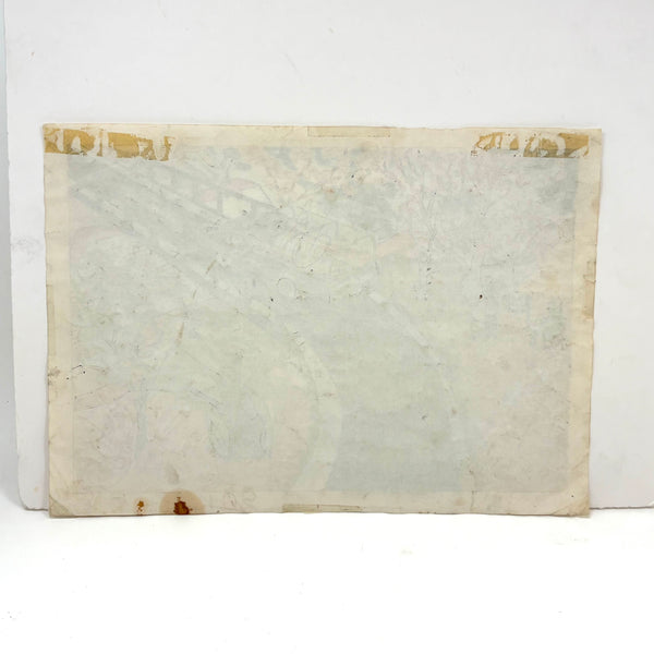 11 3/4" x 9 1/2" and in good condition, watercolor on paper. A few stains and a little toning visible around the border.