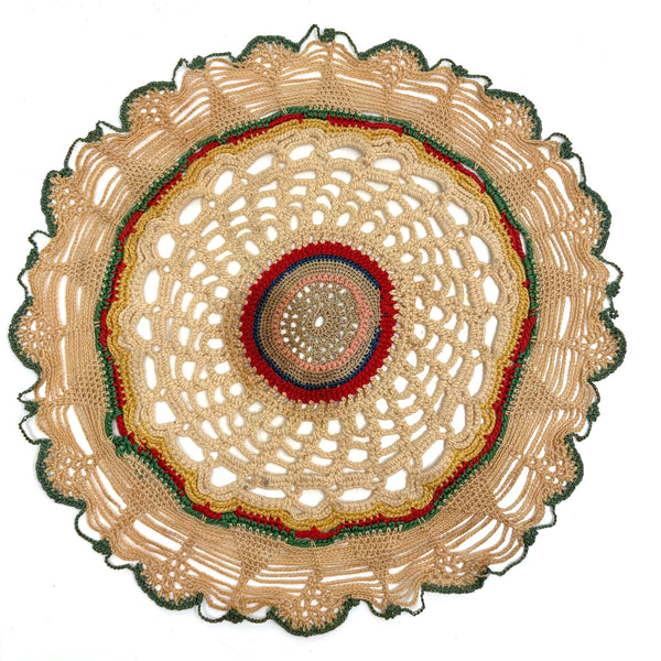 I just love this and find it quite transcendent of its doily-hood; I'd be inclined to frame it or pin it directly to a white wall to looks at it that way. To my eye evocative (especially this time of year) of a spiderweb, and capturing all of a spiderweb's delicacy and fineness. And with the precise feeling use of color making it seem almost as if depicting some sort of cellular structure--or energy field.