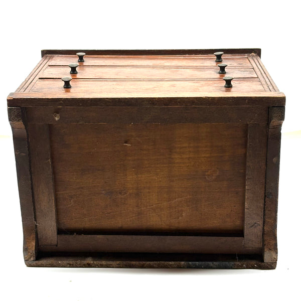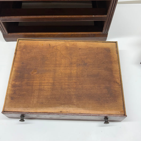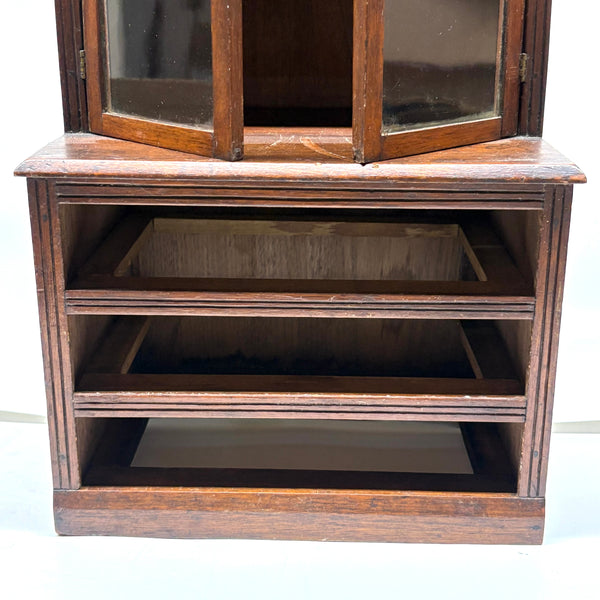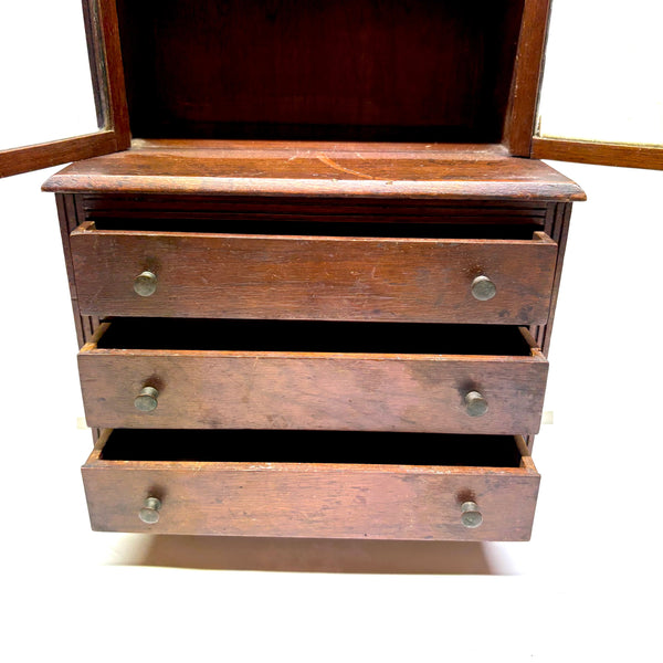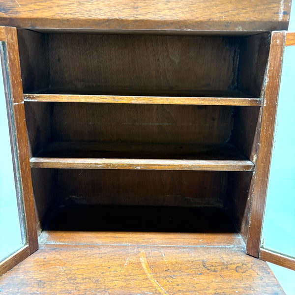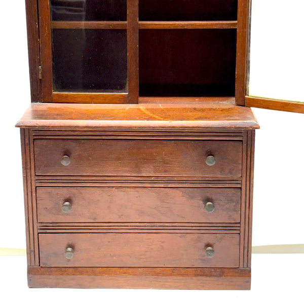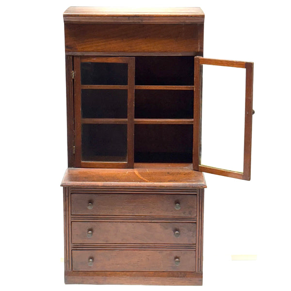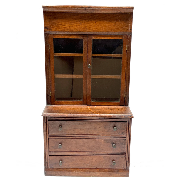 I'm not very knowledgable about furniture, tabletop or full scale, but I do know, from looking at a whole lot of tabletop scale chests, that this is of a different ilk than most described as salesman samples; it is truly that, or an apprentice piece, not a piece of doll furniture, and a rare one in my experience for being what I think would correctly be called a step back cupboard, with three drawers below and glass doors encasing three shelves above. Photos don't give a good sense of scope, but it is substantial, 18+ inches tall and just shy of 10 inches wide, and fairly heavy, with the glass doors opening and closing tightly together. Well crafted, solid and sturdy, crisp and smart looking, and large enough really to put some things inside. I am consciously resisting buying things that require a larger than usual box, but I could not pass this one by, found in Upstate NY near Albany.