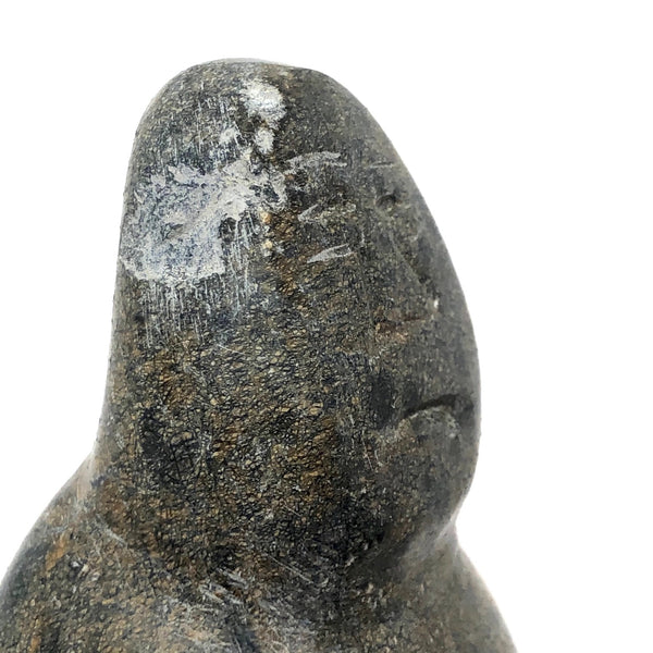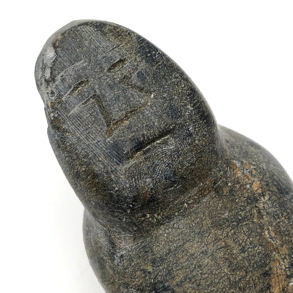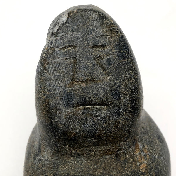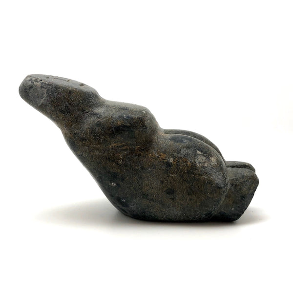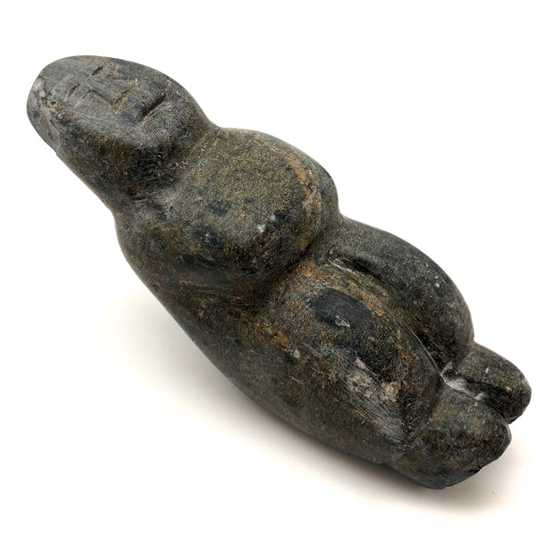 I've written before that my favorite Inuit sculptures possess an internal tension, holding apparently competing instincts or states of being in balance. I also tend to love those that more "primitive" than highly refined. Both hold true with this figure, whose posture is everything--three-quarters reclining, as if at rest, but certainly flexing one's core muscles to hold there! The profile created is of four gently curving steps, and the view from above is of a serene, open, broad-nosed face looking straight up toward the heavens. Wonderful.