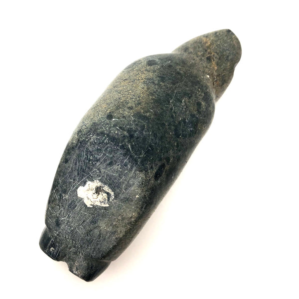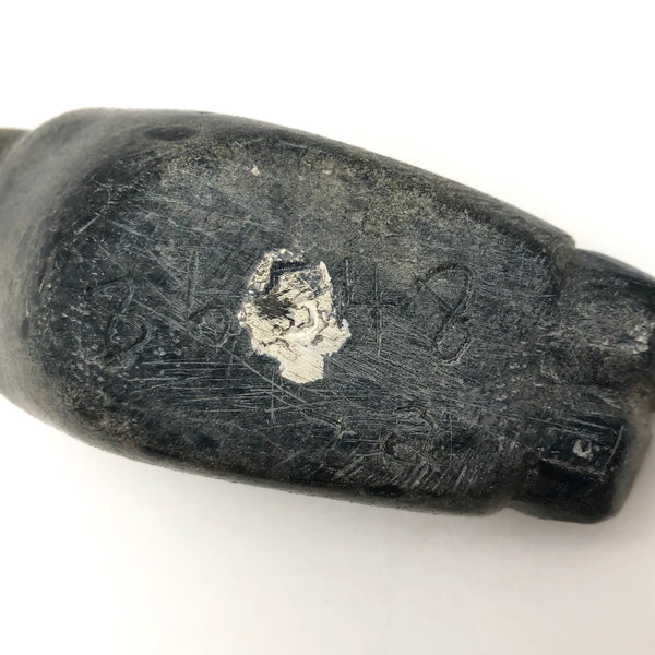 Mid-century or earlier I believe (and indeed, this feels like quite an old one), with disc numbers carved into the bottom, which appear to read 86548. There is a fair amount of irregularity to the stone, as shown in photos, and a rough area on the left side of the head. 5 3/4" l x 3 1/8" t x 2" w.