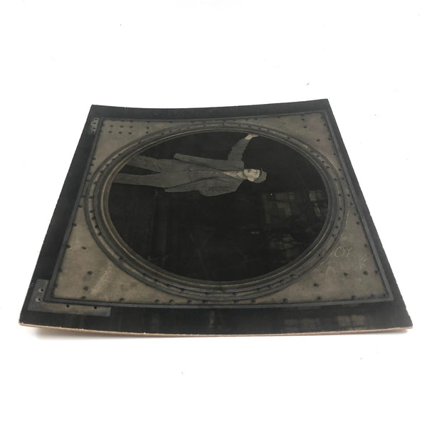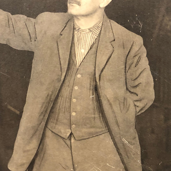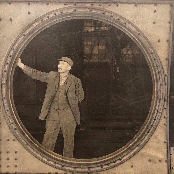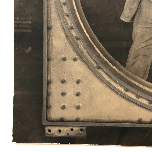 A super striking image I think, and I've gone back and forth on whether it a straight photo or a trick one--and am still not entirely sure. It looks like the interior of an iron or steel works or related sort of industrial factory, visible behind our man, with a fair amount of detail evident with close looking, and the view of the interior extends all the way to the edges of the photo, such that it seems it may actually be a very piece of large iron or steel that has been stood up in the factory, which our subject grips with one hand. Or, perhaps it's a image of a steel plate that has been juxtaposed with the other, creating the illusion of framing him! Looking closely (with magnification), it appears the lines of his suit were emphasized with hand-drawing, but to me it appears as if these were done on the negative rather than on the image itself. Quite an unusual occupational photo as far as I've ever seen, and one I can't stop looking at.