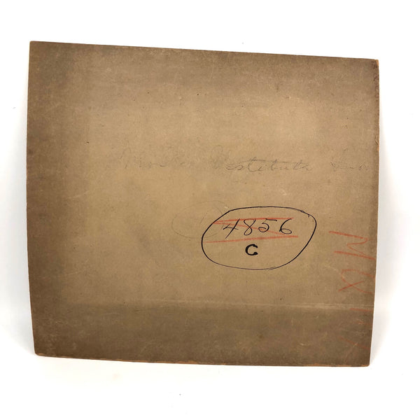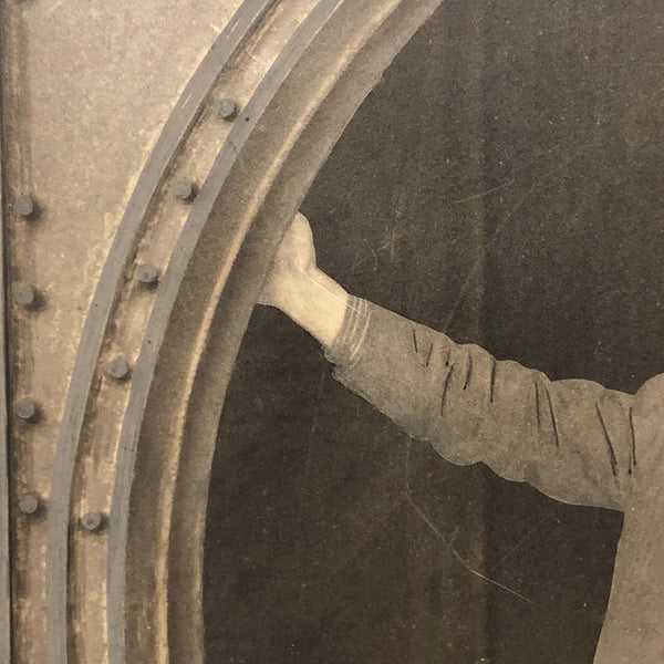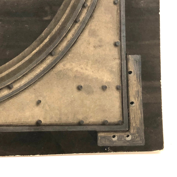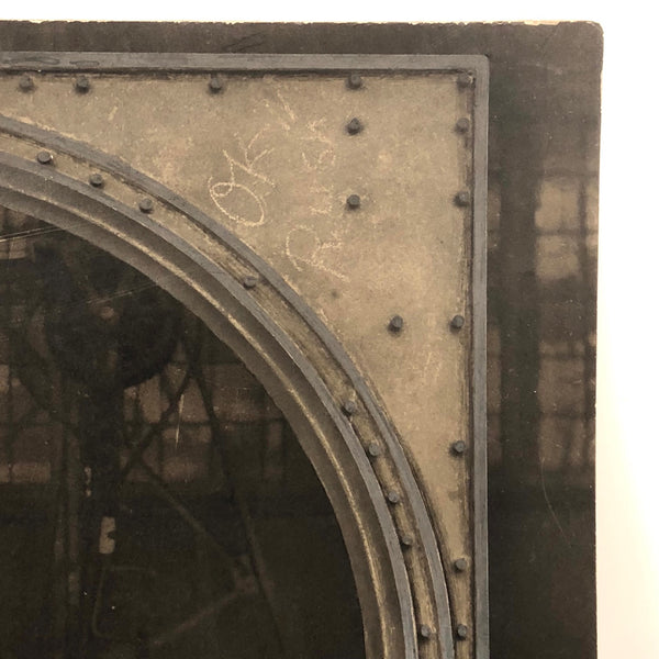 9" x 10", mounted to board. Some warping to the board, which I've managed to slowly improve with a little weight on top of it and will continue to do. Otherwise very good condition, super graphic, crisp and clear. The back of the photo seems to read "Master Vestibule Door" which seems to advance the argument that it is a straight photo.