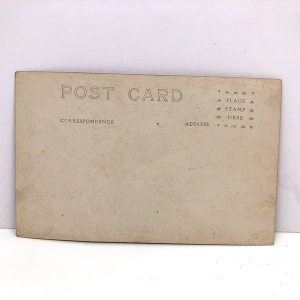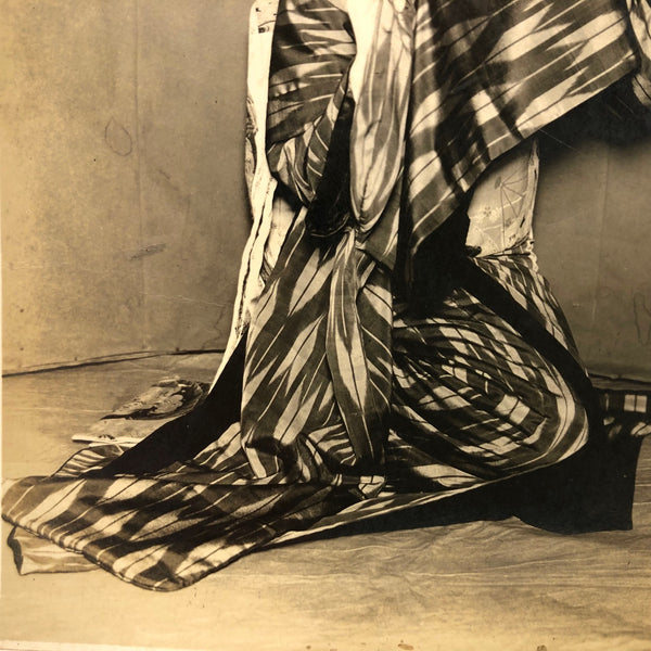 With her white painted face, I believe this real photo postcard captures a kabuki actress playing a geisha, late 1910s/early 1920s. I find the image really striking, between her side cast gaze, the manner in which she holds the sleeve of her kimono stretched before her like a mask, the pattern of the textile itself, and the plain, seams-showing context in which photographed, perhaps at the corner of a stage. Gorgeously rich tonal range and black black, too. Feels to me both beautifully specific and also speaking much more broadly to aspects of femininity, seduction and the nature of the desire.