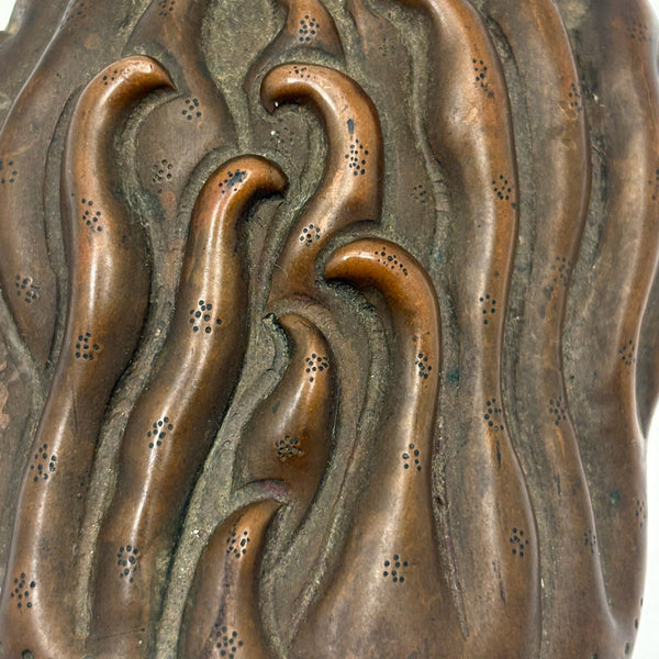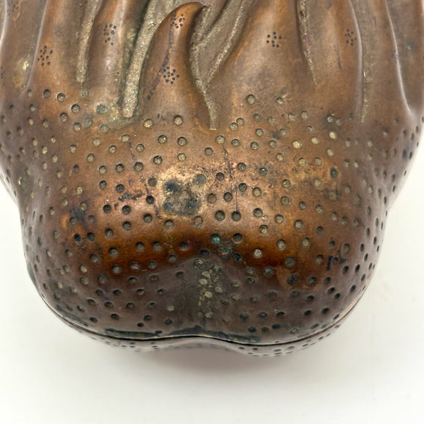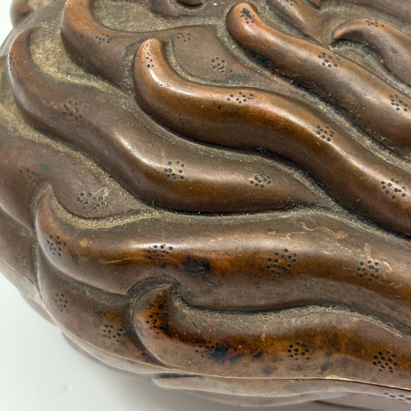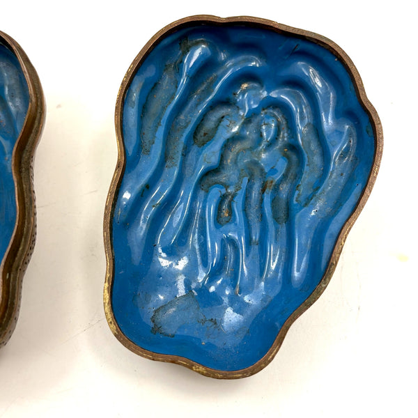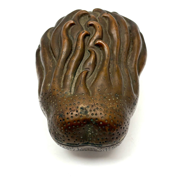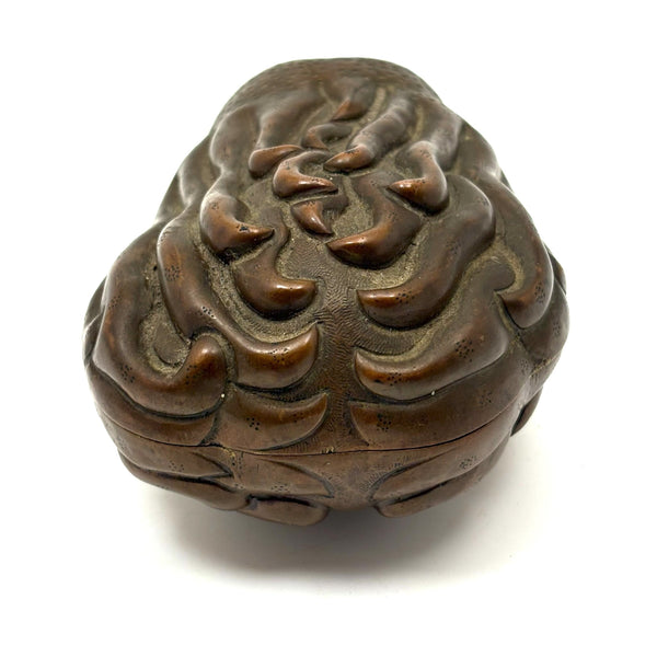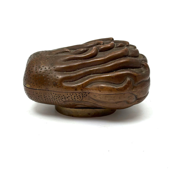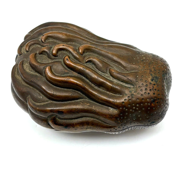 Another beauty from a visit to my favorite cabinet of curiosities in New Hampshire this week. This is Chinese, bronze I believe, and portrays a fingered citron fruit, also known as a Buddha's hand--which looks like a lemon with long fingers and is often used as an offering in Buddhist temples and a decoration during holidays like Lunar New Year, symbolizing longevity and good fortune. I have found an antique (18th c.) example closely resembling the manner of this but carved of boxwood, but I can find no other example of a box in bronze. I find it very fine and completely gorgeous and also elemental feeling, with those "fingers" evocative of everything from waves to flames. And with marvelous bright blue enameled interior and underside. I would be very very glad to keep this one for myself.