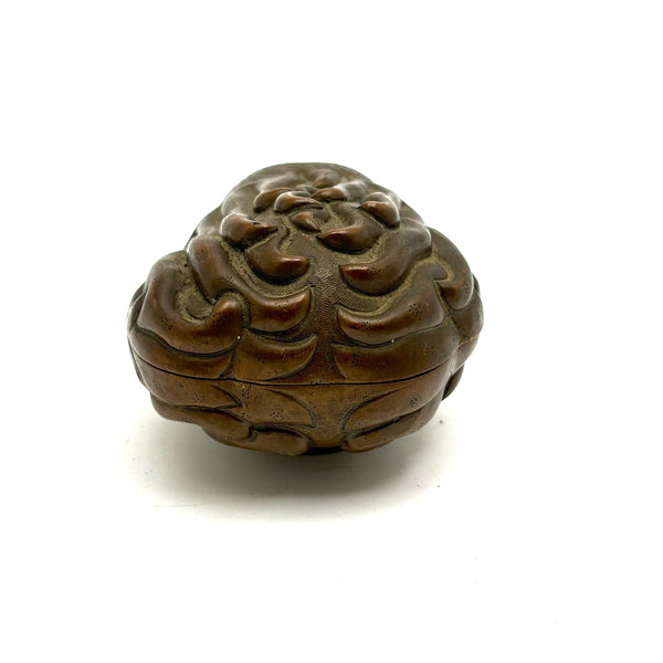 4 1/4" l x 3 1/8" w x 2 1/2" t. Beautiful believe antique condition, very rich patina to the bronze (you can see by comparing to the underside), top fits over bottom seamlessly, such that it feels much more of a whole object than a box. Just a tiny bit of spotting to the surface at the narrow end, as documented with magnification, very minor.