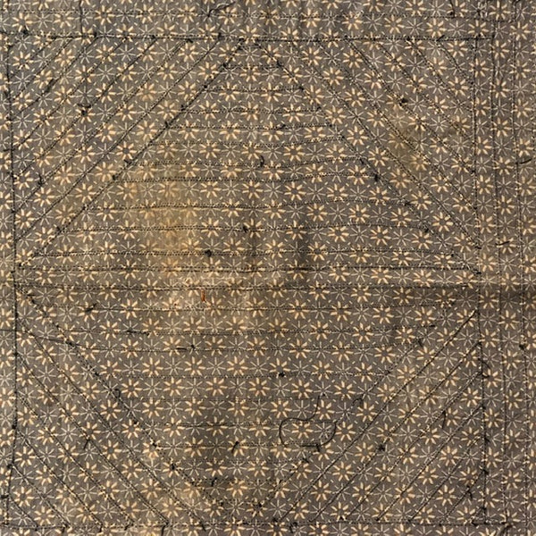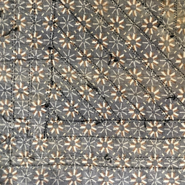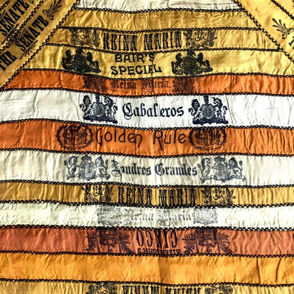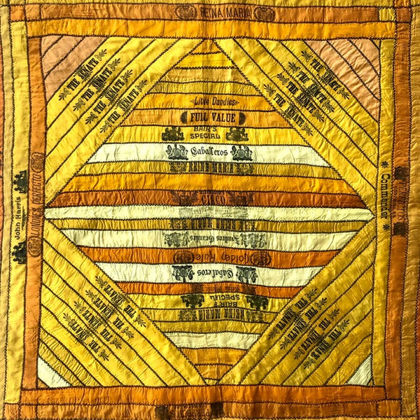 This is the third cigar silk quilt I've had in the shop, and I'll keep snatching them up when I find them as I think they are completely stunning. How wise and resourceful of it was for women not to let cigar silks/ribbons go to waste, especially brilliant gold ones like these. (Meanwhile, their fathers or husbands were cutting and carving up the cigar boxes to make tramp art frames and the like.) I love the range of silks incorporated into this one, delivering a spectrum of yellows and oranges as well as an assortment of logos that read together like found poetry: Little Dandies, Full Value, Commanders, etc. (I especially love the repeated use of "The Senate" for the corners, making it feel particularly timely!) Very nicely stitched with tiny black xx's, which add another decorative element, and backed with fabric, a sweet gray, tan and cream calico. Super radiant and graphically stong, this would be great framed or just hung directly on the wall.