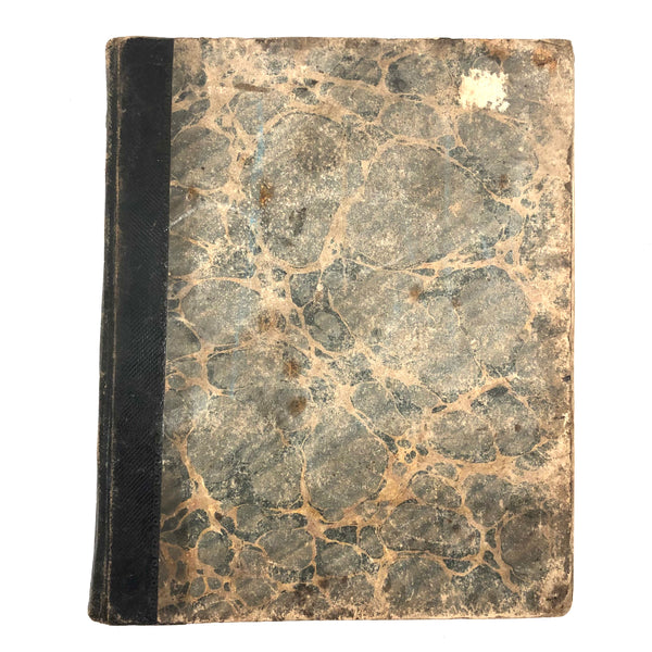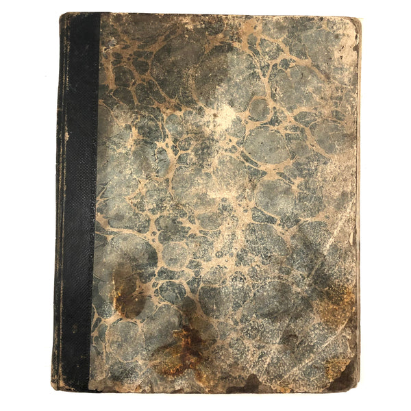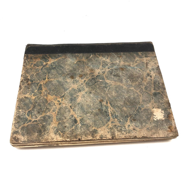 9 1/8" x 7 1/2". 81 pages by my count, all filled front and back. At some point, a few pages appear to have been removed, and there is one loose page; otherwise all are well bound, with hand-marbled cover. Bleed through on a few, but in a beautiful and evocative way. No tears, paper not fragile, black ink clear and bold and wonderful.
