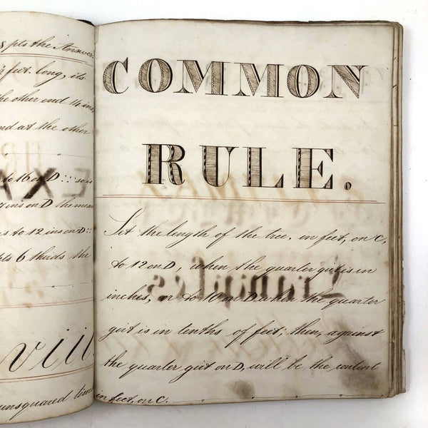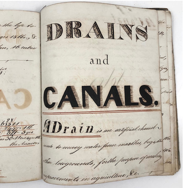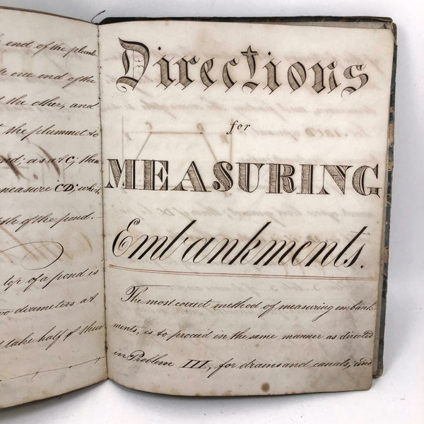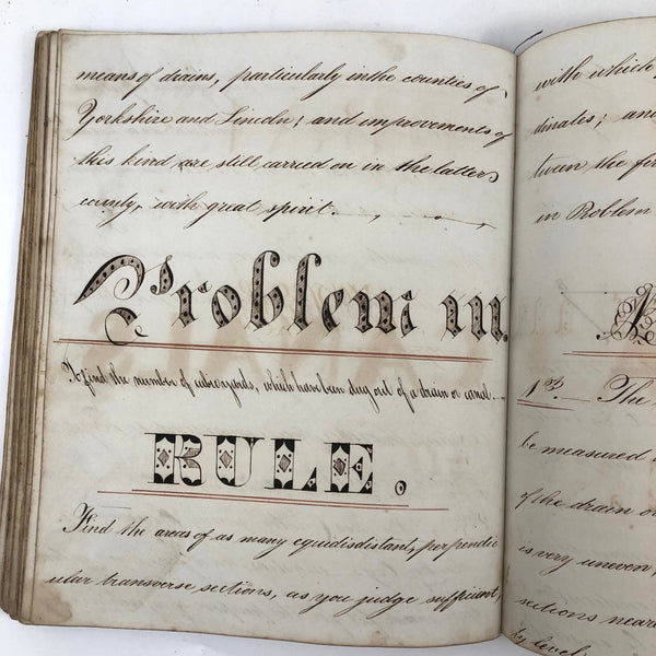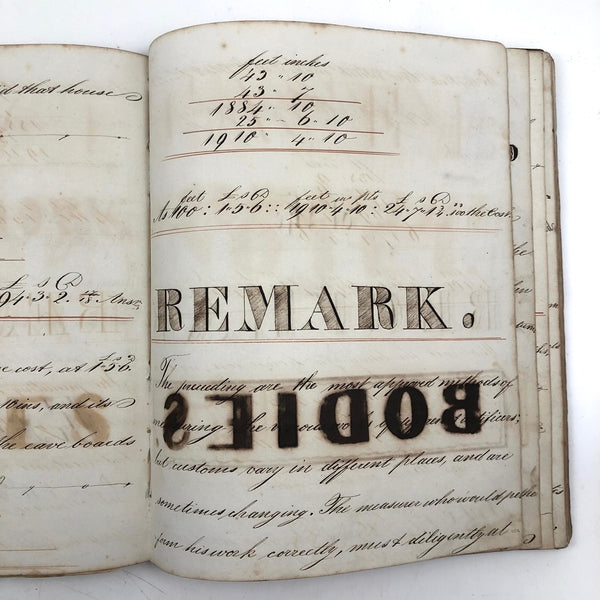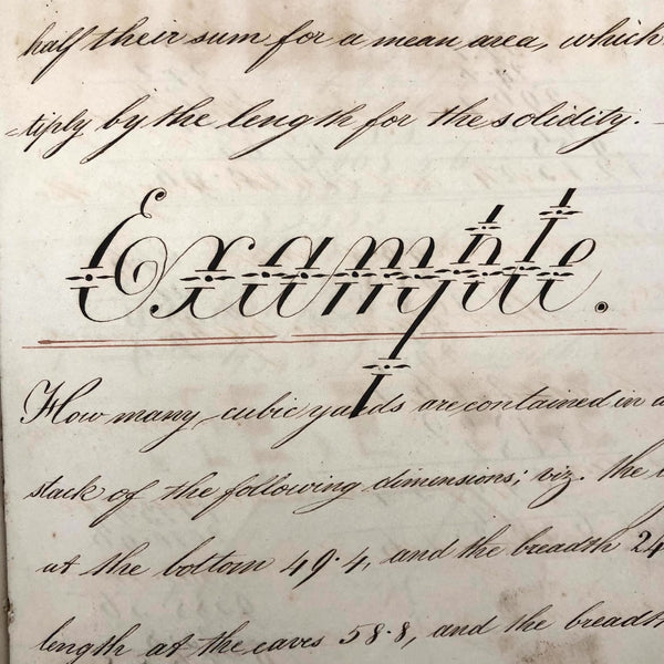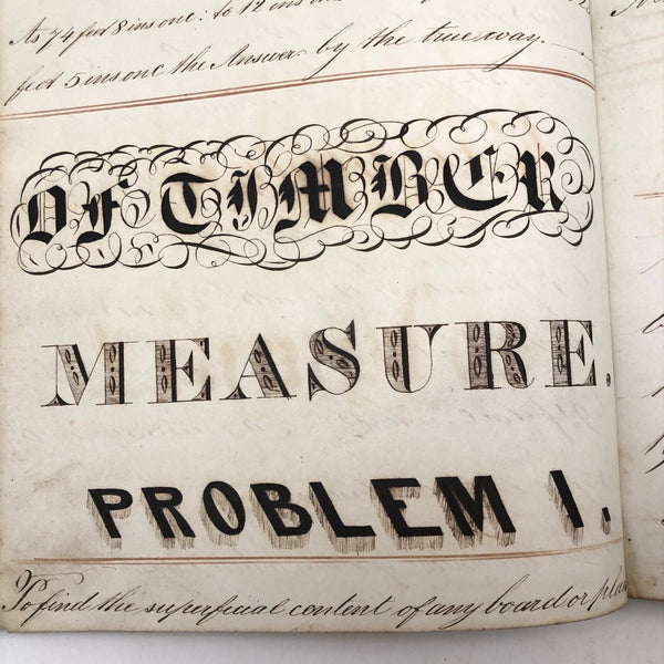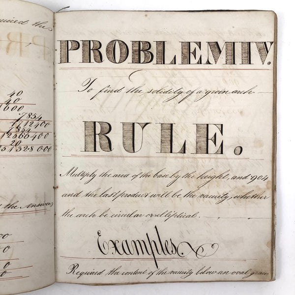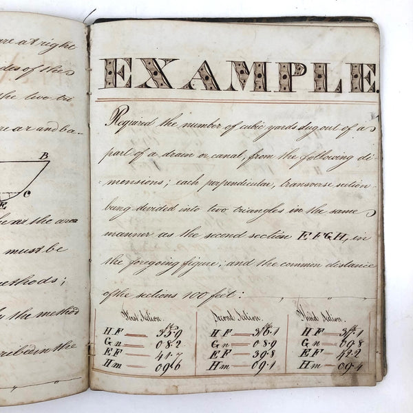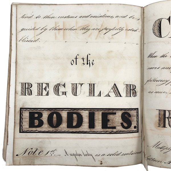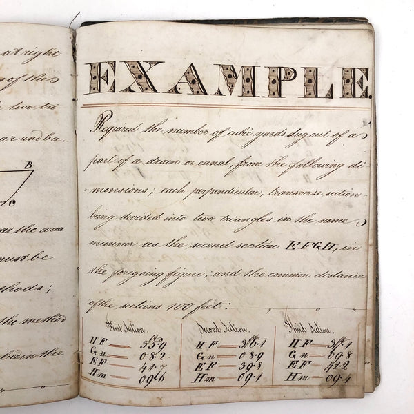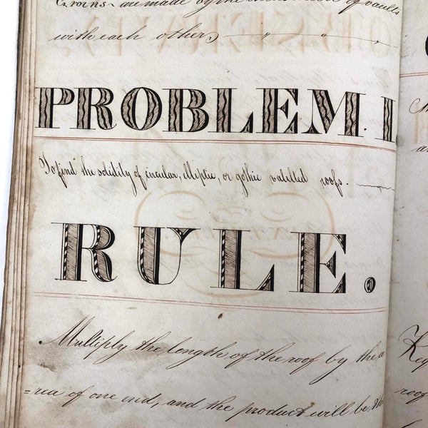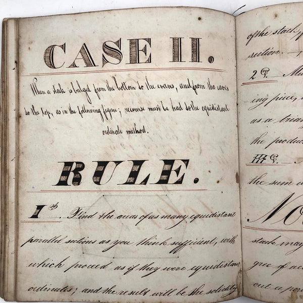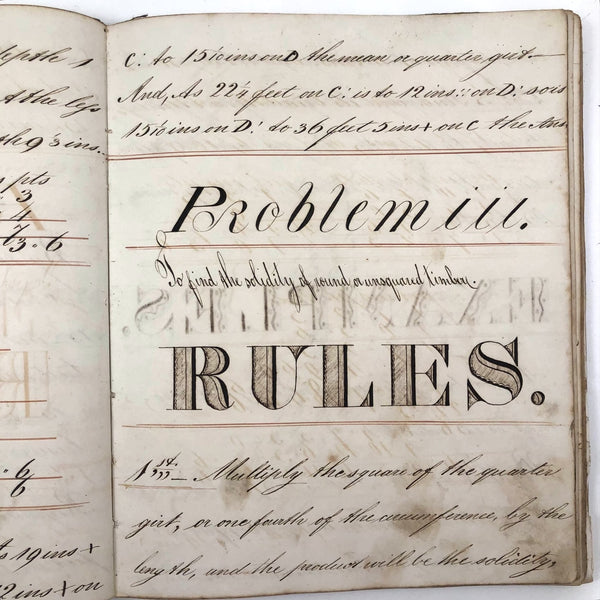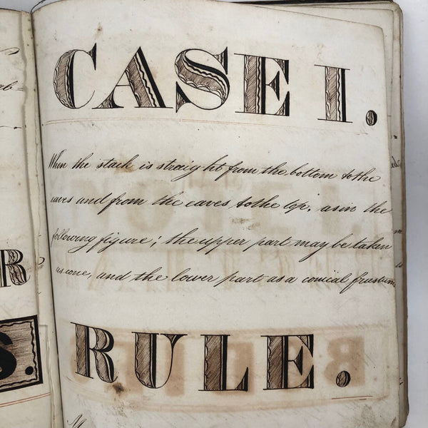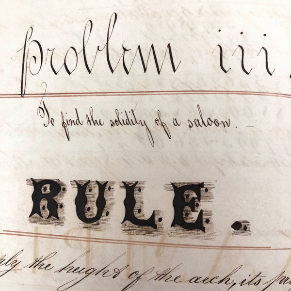 It's been quite a long time since I had a notebook approaching the beauty of this one--and I've never had one with SO MANY boldly and ornately penned fraktur type headers, populating more of its 81 pages than not. The headers--sometimes filling the entire page--are unusual, too, and to my sensibilities often quite poetic: "of the Regular Bodies," "Drains and Canals," "Of Bricklayers' and Masons Work, "Directions for Measuring Quarries and Coalheaps," etc. Or, simply, "RULES," or "OBSERVE." Just gorgeous, and wioth the lettering often feeling very contemporary feeling. And useful too should one need to measure a milldam! Some lovely diagrams and calculating, too. Photos do a very good job of documenting (not comprehensive, but I do always feel like it is my duty to document these singular things thoroughly before they leave my hands.) C. 1820s-40s I believe.