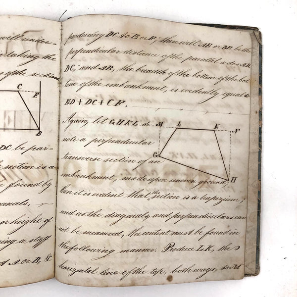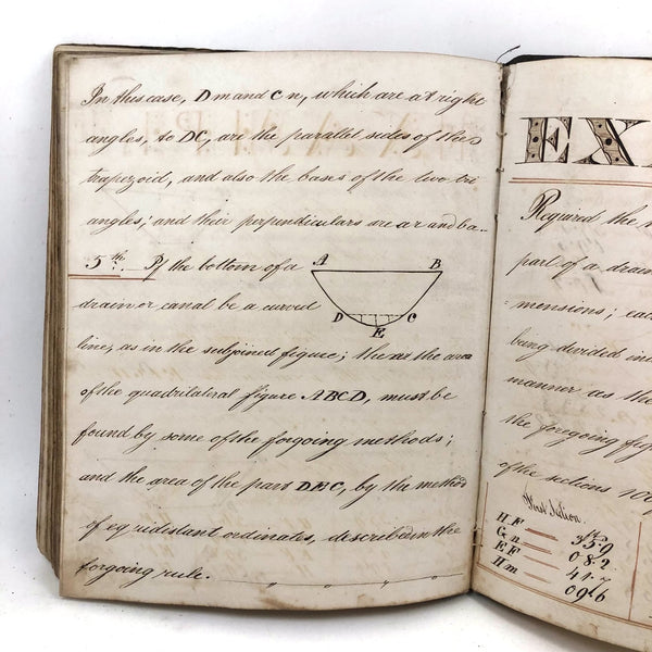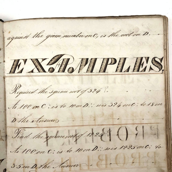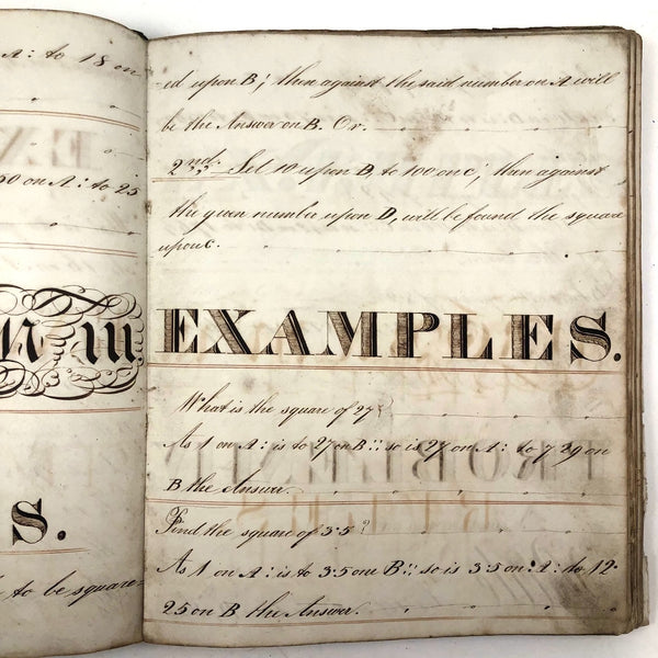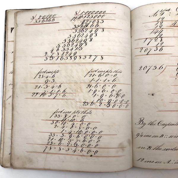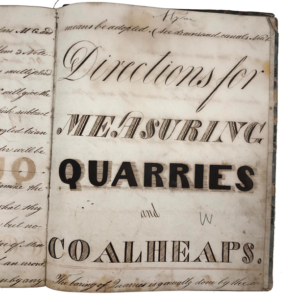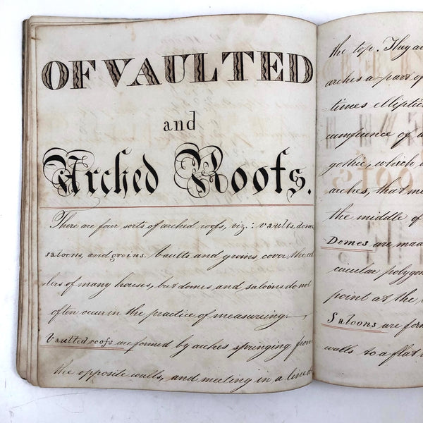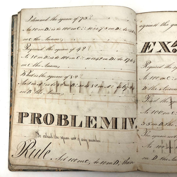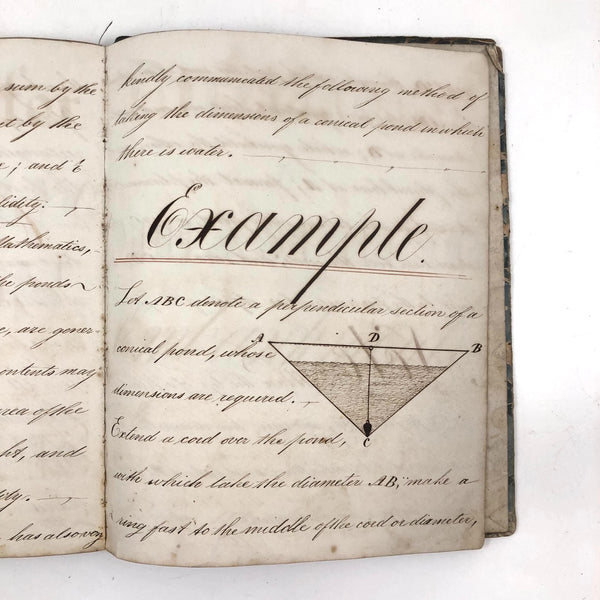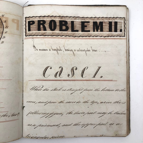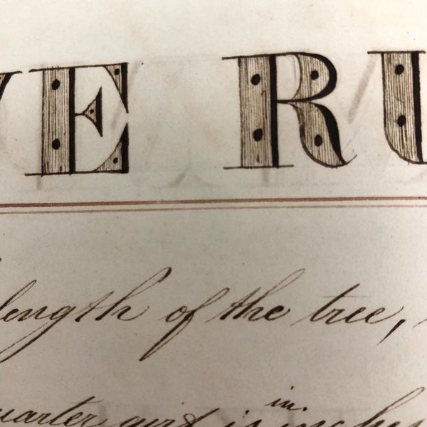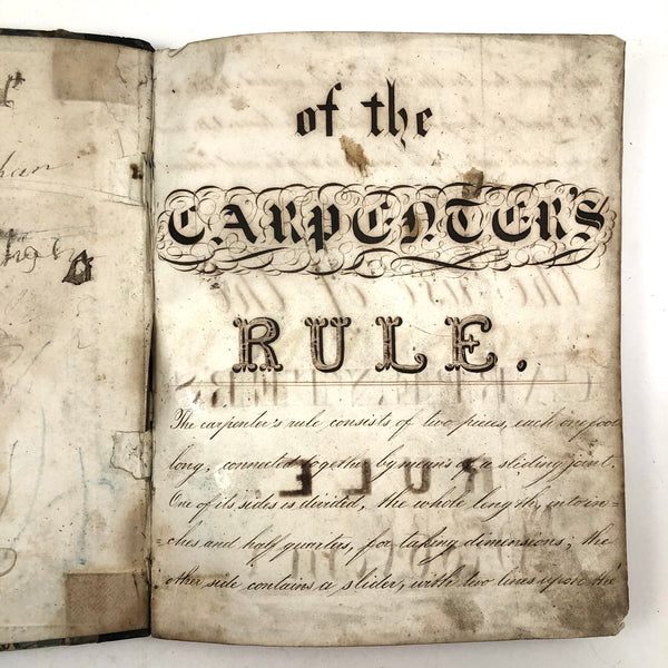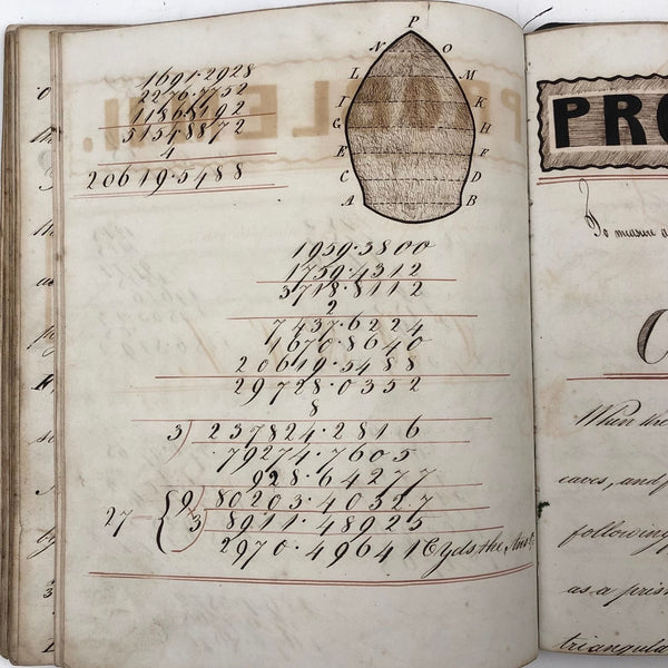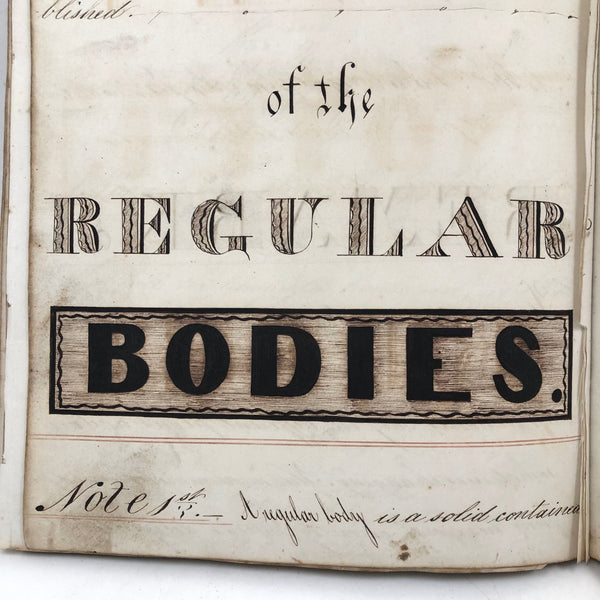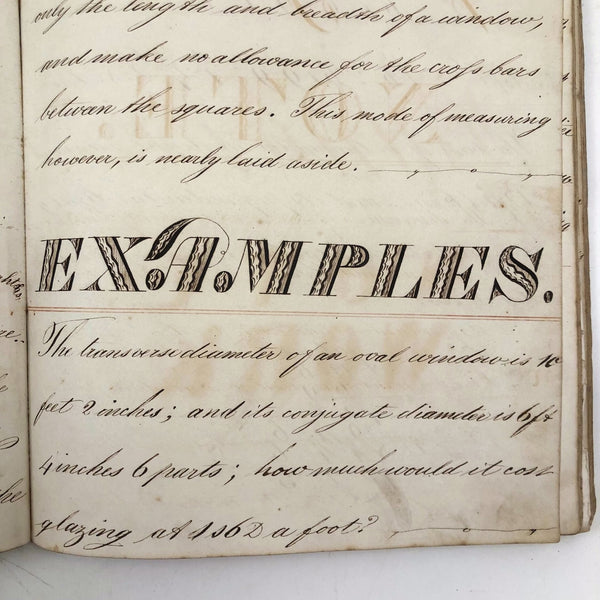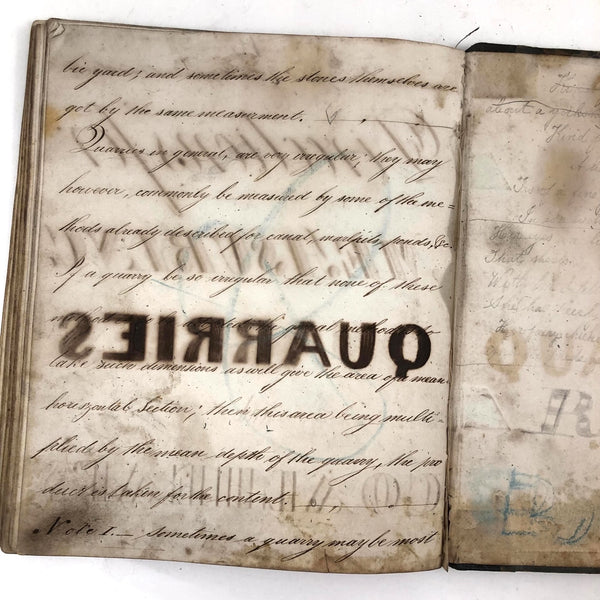 It's been quite a long time since I had a notebook approaching the beauty of this one--and I've never had one with SO MANY boldly and ornately penned fraktur type headers, populating more of its 81 pages than not. The headers--sometimes filling the entire page--are unusual, too, and to my sensibilities often quite poetic: "of the Regular Bodies," "Drains and Canals," "Of Bricklayers' and Masons Work, "Directions for Measuring Quarries and Coalheaps," etc. Or, simply, "RULES," or "OBSERVE." Just gorgeous, and wioth the lettering often feeling very contemporary feeling. And useful too should one need to measure a milldam! Some lovely diagrams and calculating, too. Photos do a very good job of documenting (not comprehensive, but I do always feel like it is my duty to document these singular things thoroughly before they leave my hands.) C. 1820s-40s I believe.