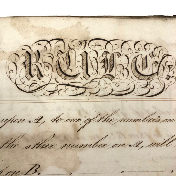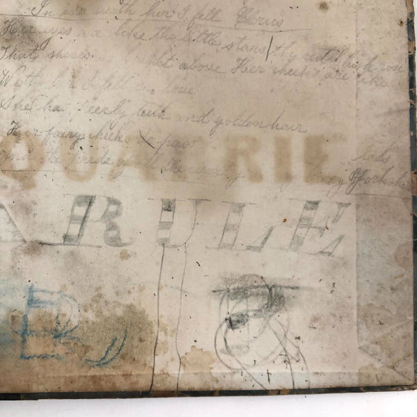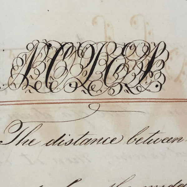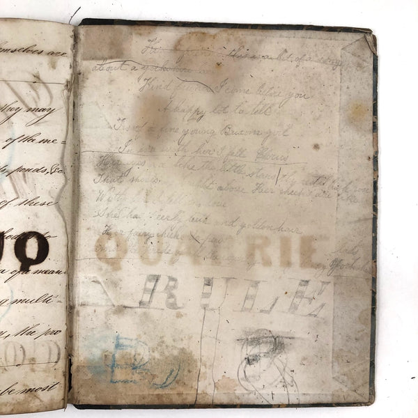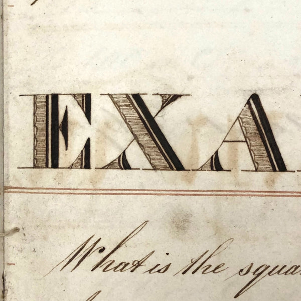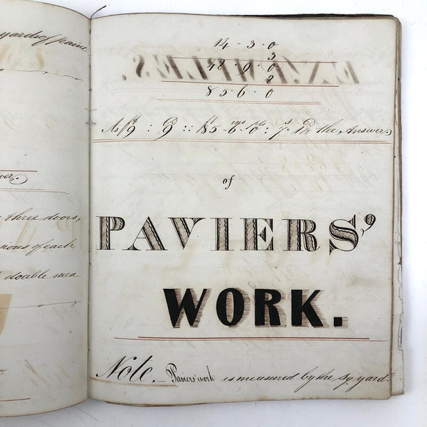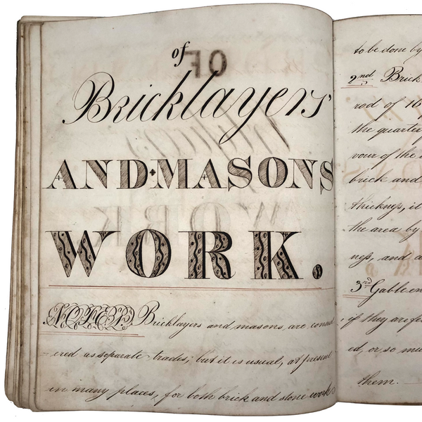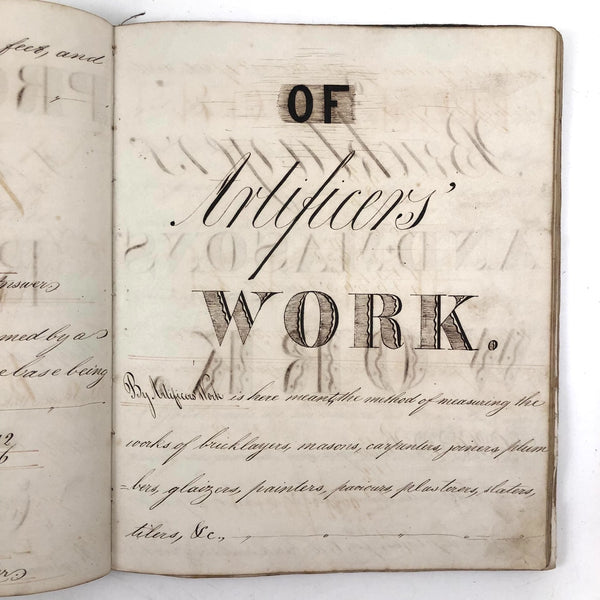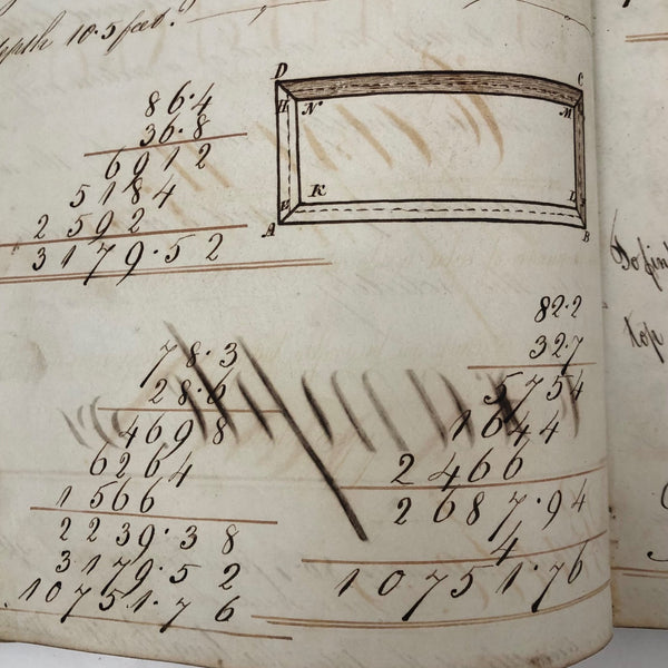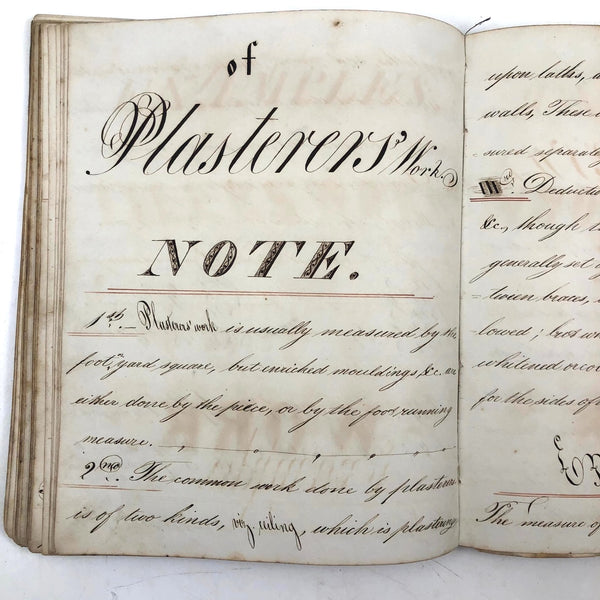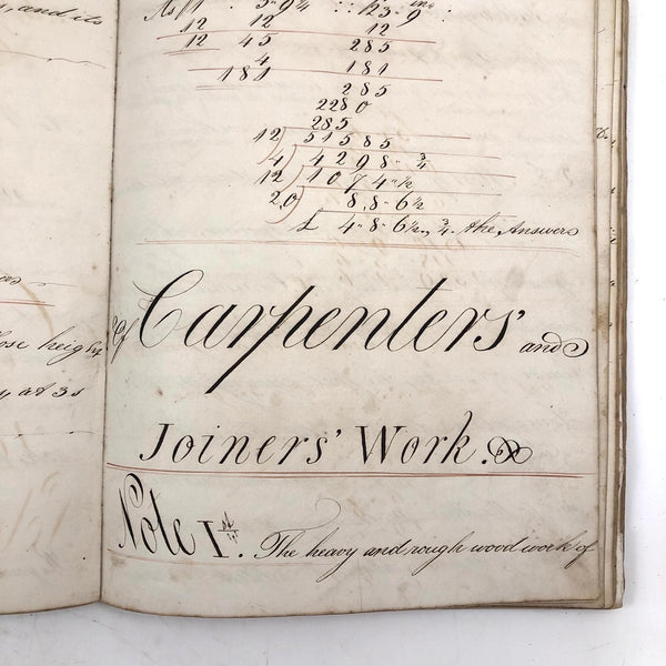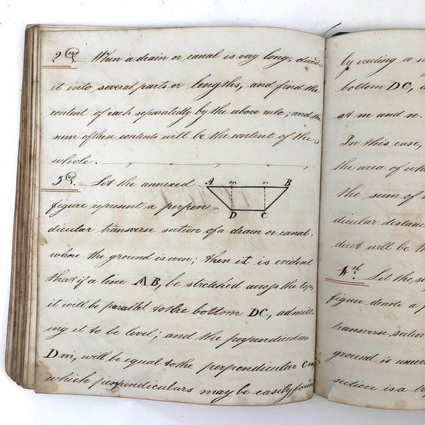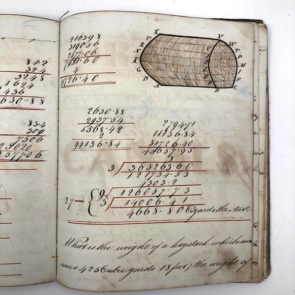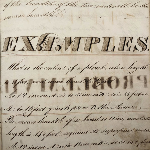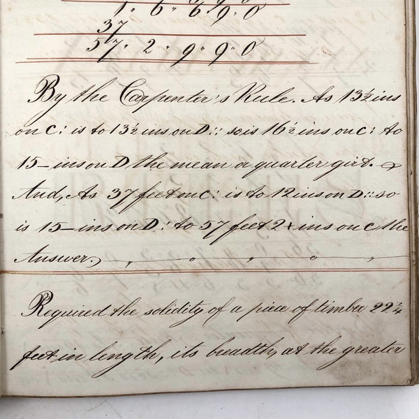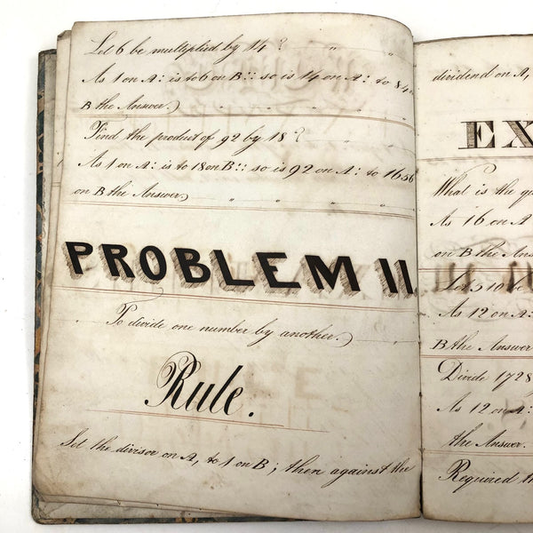 It's been quite a long time since I had a notebook approaching the beauty of this one--and I've never had one with SO MANY boldly and ornately penned fraktur type headers, populating more of its 81 pages than not. The headers--sometimes filling the entire page--are unusual, too, and to my sensibilities often quite poetic: "of the Regular Bodies," "Drains and Canals," "Of Bricklayers' and Masons Work, "Directions for Measuring Quarries and Coalheaps," etc. Or, simply, "RULES," or "OBSERVE." Just gorgeous, and wioth the lettering often feeling very contemporary feeling. And useful too should one need to measure a milldam! Some lovely diagrams and calculating, too. Photos do a very good job of documenting (not comprehensive, but I do always feel like it is my duty to document these singular things thoroughly before they leave my hands.) C. 1820s-40s I believe.