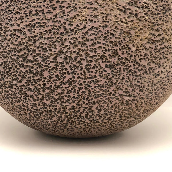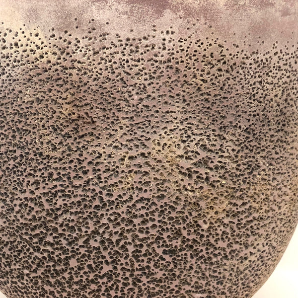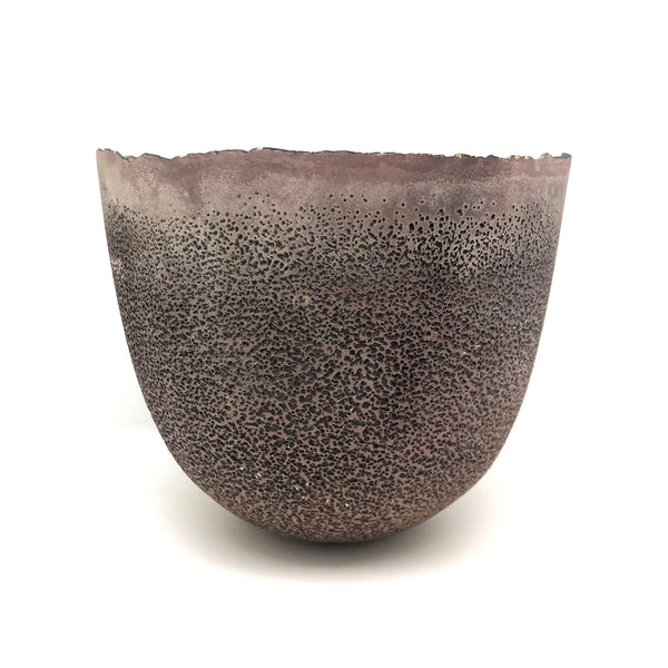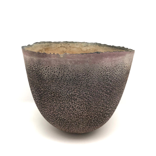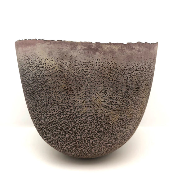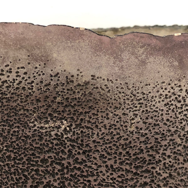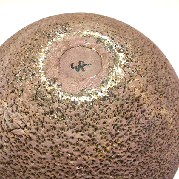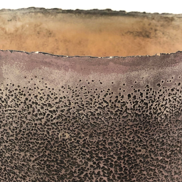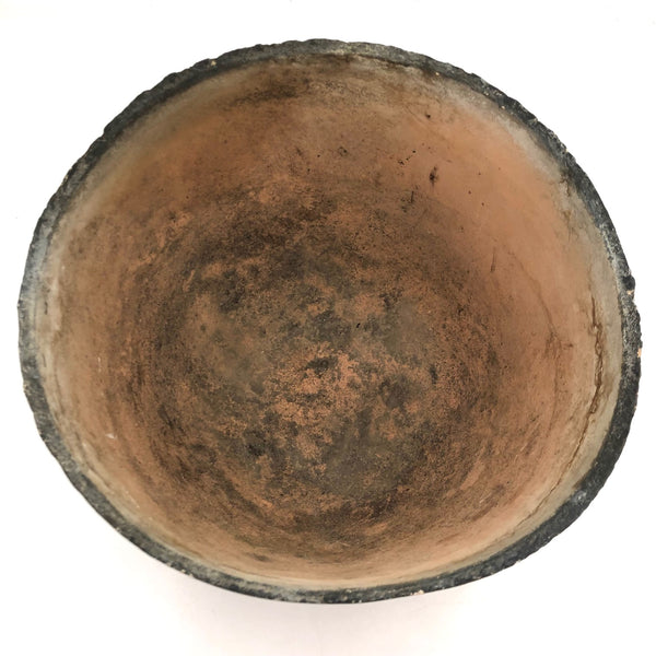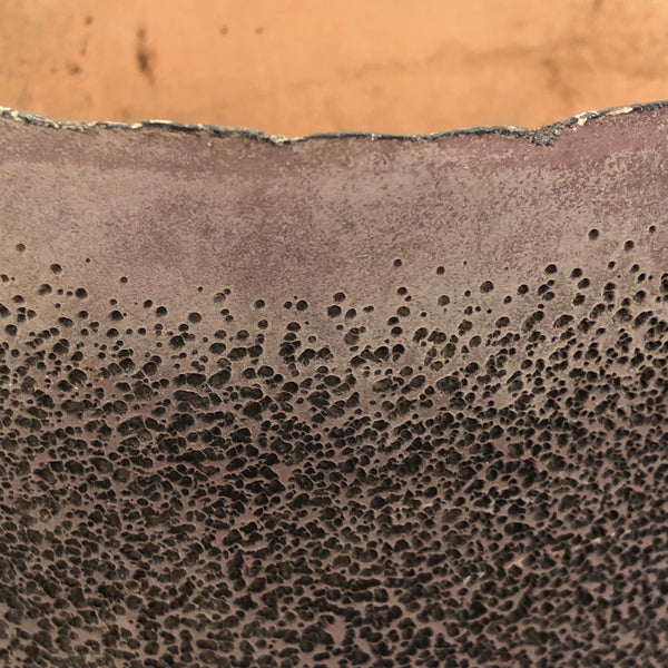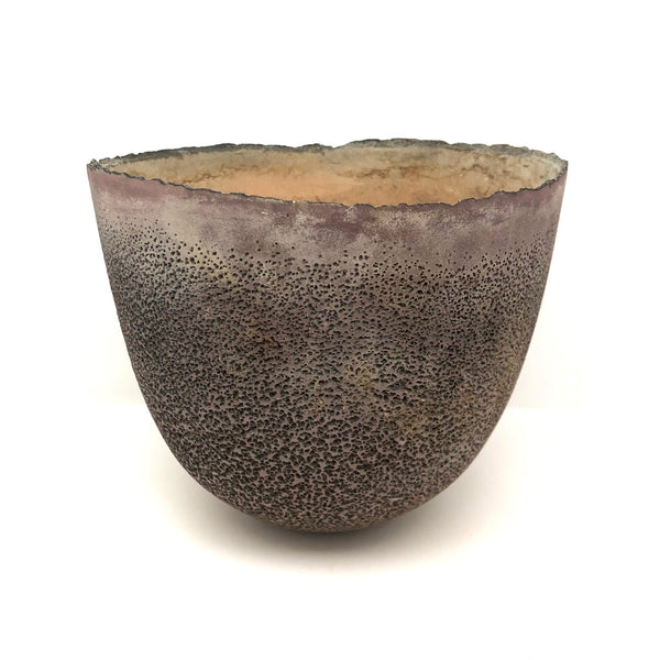 This one took my breath away when I found it, to my eye just stunning-- looking completely at home in the context I spotted it, arranged among ancient pots, and as if it might have just been dug out of the ground, though maybe ion another planet! Signed ER on the underside, I believe it is the work of Emily Rossheim, a much renowned, Vermont-based contemporary studio ceramicist widely known for slab-built vessels of a similar form but typically finished in more electric colors, with the color produced by airbrushed underglazing. The interior of this one is the color of terra cotta, perfectly complimenting the fantastic texture and luminous stony purple-gray of the exterior. And then this gorgeous raw edge around the top.