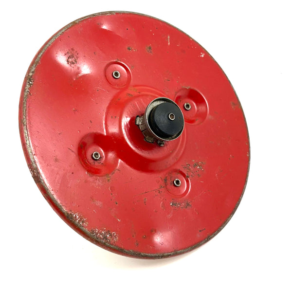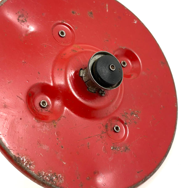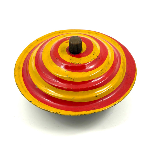 Just terrific color and excellent optical effects when one sets these old tops spinning. I have had one of the larger ones before, which features four tri-color tin litho disks with serrated edges on the face of it, each overlapping the next (looking as if they might themselves turn like wheels but they don't), but this is a rare one for having its original layer of protective celluloid film over top of the disks. The smaller has a bell inside, which rings when spun.