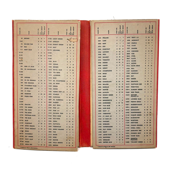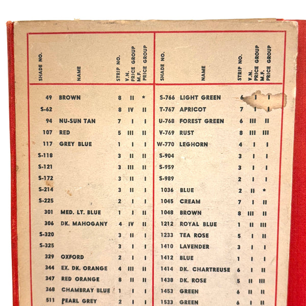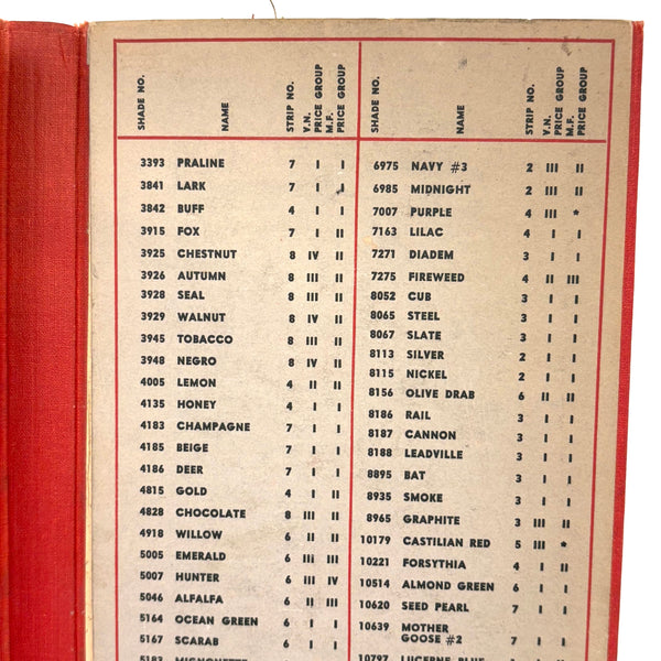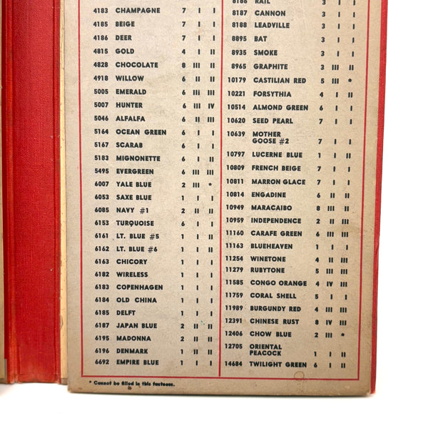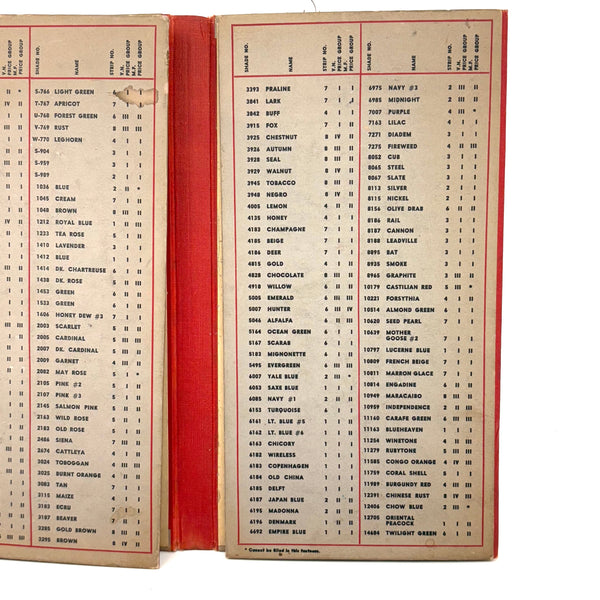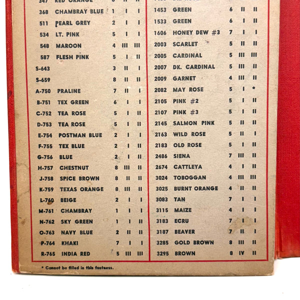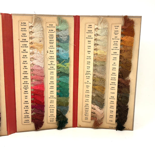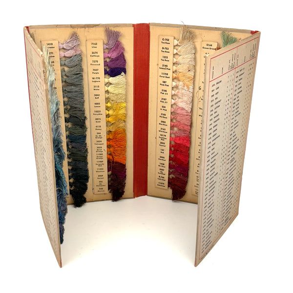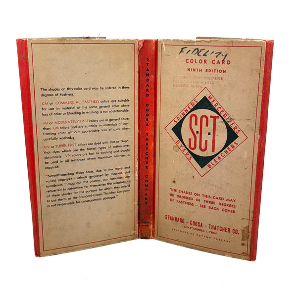A really great thread dye color card--though card seems an understatement, more like a portfolio, with a full spectrum of 160 colors represented. With a fat tassel of cotton thread for each shade, the name of the color printed next to it, and then a full list of the colors on the reverse sides with pricing category codes. This was produced by Standard Coosa Thatcher (SCT) Co., Chattanooga, Tennessee--a textile corporation founded in Piedmont, Alabama in 1891, publicly traded beginning in 1922, and significant for its endurance for nearly a century, with expansion throughout the Southeast and Western US. Its first mills were built in 1916, and in 2015 its remaining mills were added to the National Resister of Historic Places there. I believe this dates to the 1920s-40s.