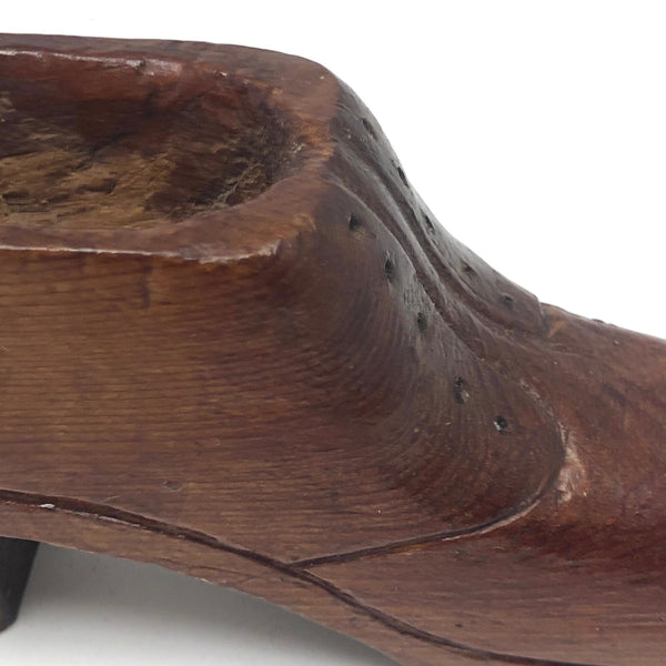 I'd think this shoe was carved just as a whimsy; there is no sign there was ever a top over the shallowly carved out recess, so I wouldn't think it was made for snuff. I do think it's pretty old though, and nice and folky, with sweet detailing for the seams, eye holes, and across the toe, a great heel, and a coat of varnish on the exterior. Surely one can never have too many old carved wooden objects, or shoes!