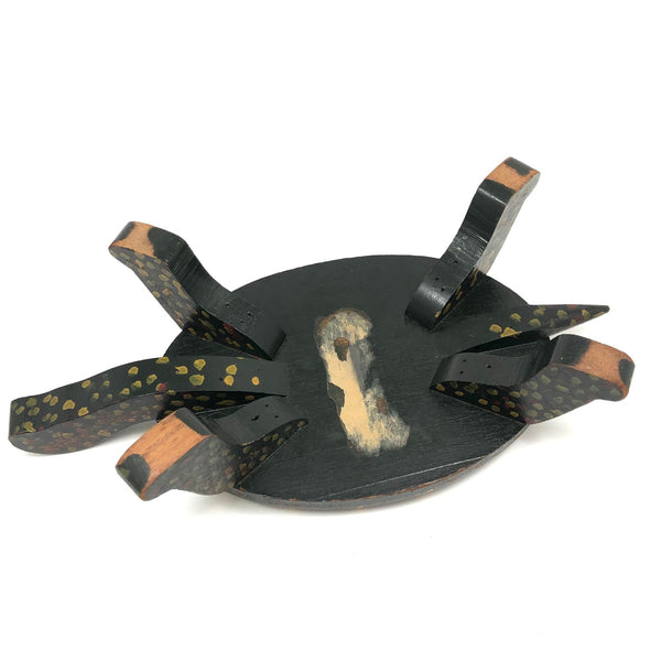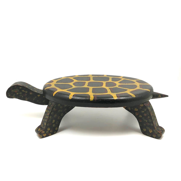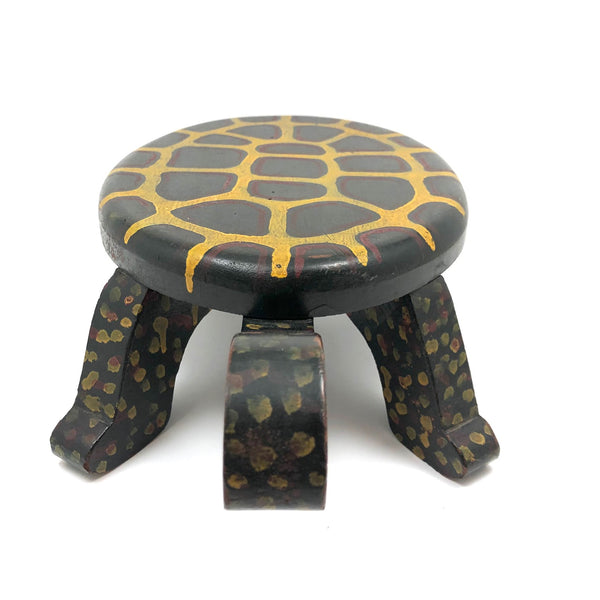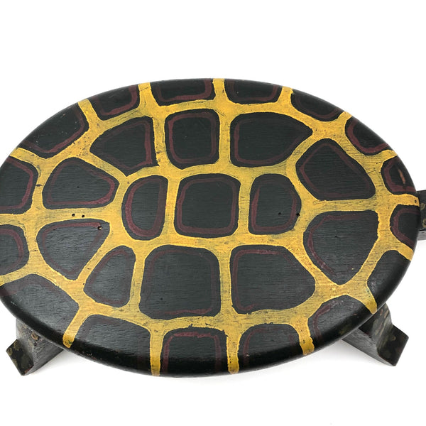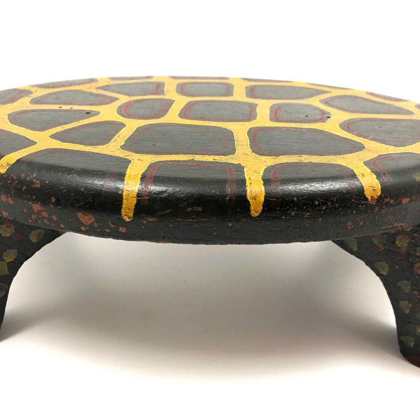 I found one of these old Pennsylvania folk art turtle footstools a year or so ago in shades of red and black and have kept an eye out since--the perfect present for a child or grandchild being groomed to appreciate American folk art! C. 1920s-30s, these were made in graduated sizes; this I believe is the second to largest variety, about 15 3/4" long. All original paint, a classic example, with a nice camouflage aspect to the light green and dark red spot painting over dark green body. Very sturdy and useful as a stool for many years to come, and very charming.