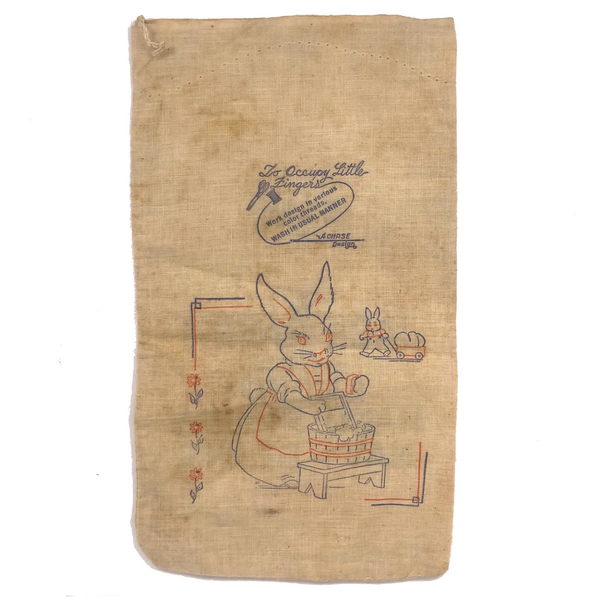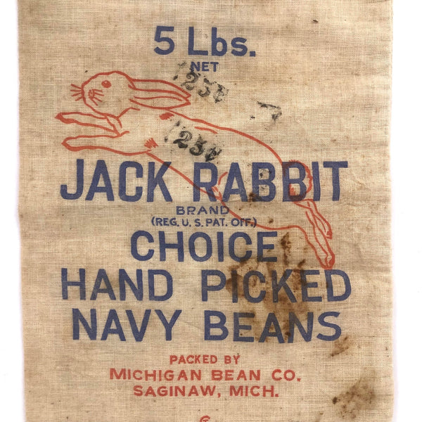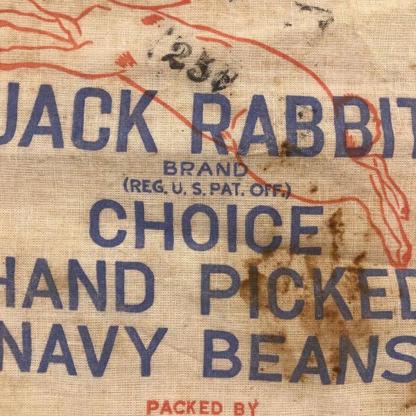 Just in time for Easter, and I think as nice a way to deliver the chocolate eggs and bunny as in a basket! This Jack Rabbit Navy Beans bag is emblematic of the rise in popularity of cotton bags from the early to mid 20th century of cotton bags as families suffered economic hardship-- the cotton could be recycled or repurposed for the other uses. As such, companies began to print the bags with patterns for making dolls and the like--here a needlework pattern on reverse "to occupy little fingers." Great graphics, and stamped 25 cents twice!