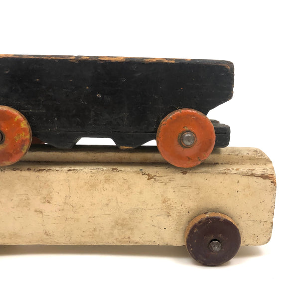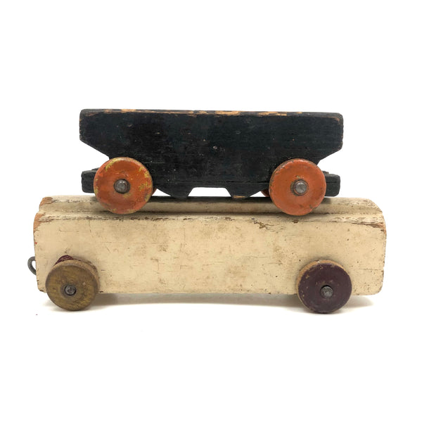 Satisfying forms, great old paint, and with the orange wheels on the black one delivering just the right color punch. Surely there were once part of a larger toy train, but just these two now, which I quite like stacked like blocks. Ah the joy of little things.