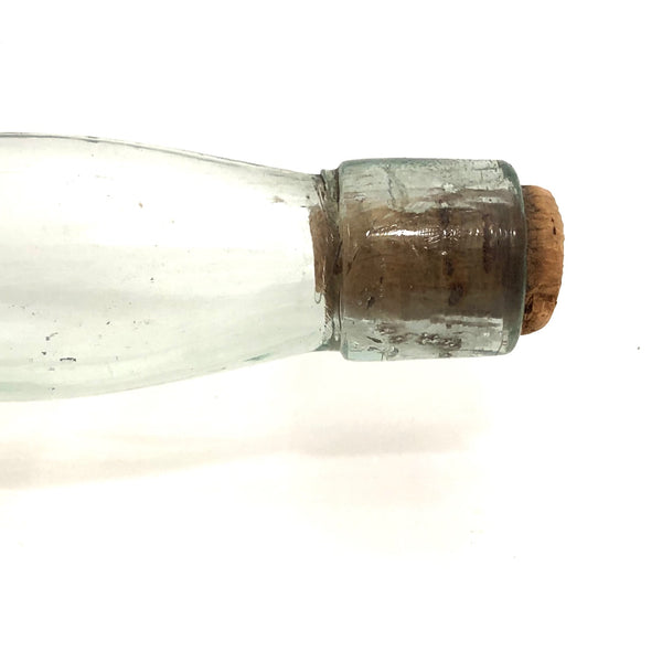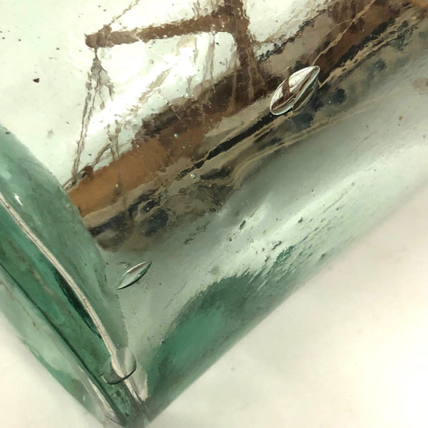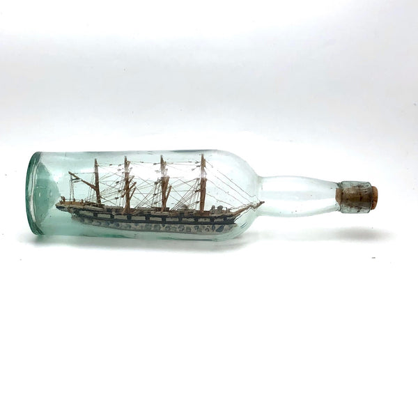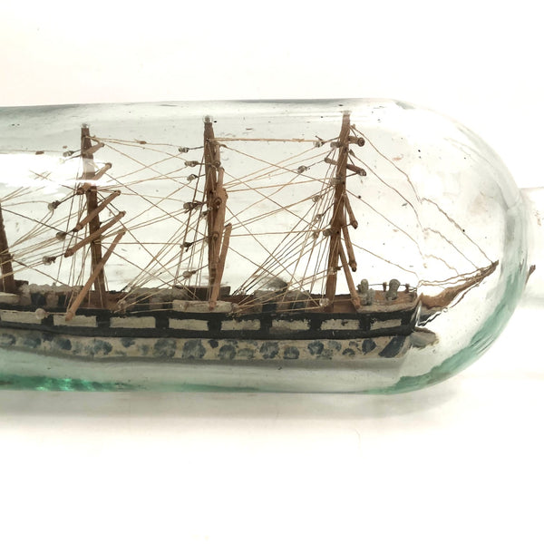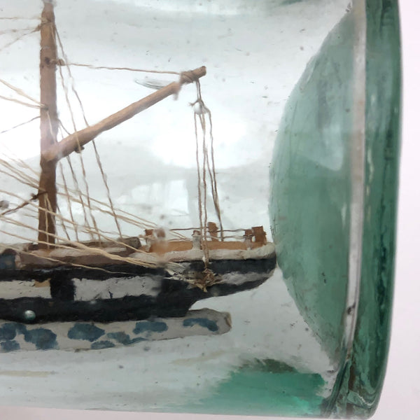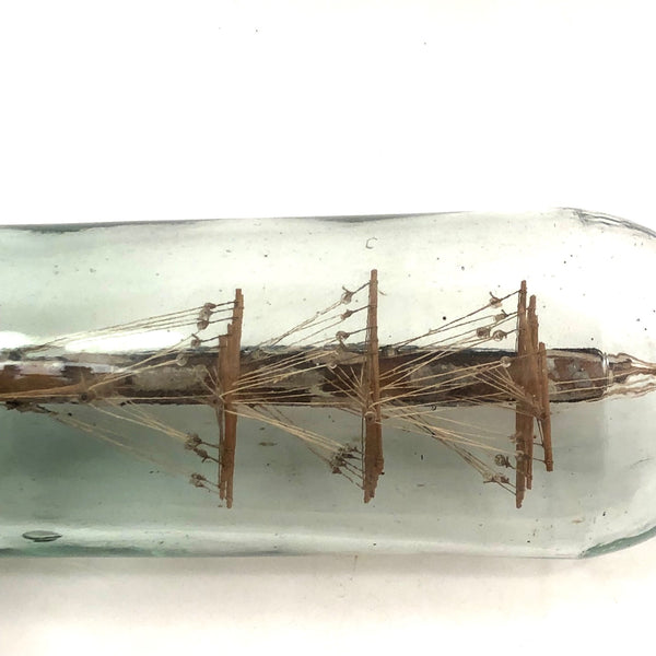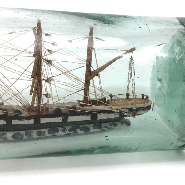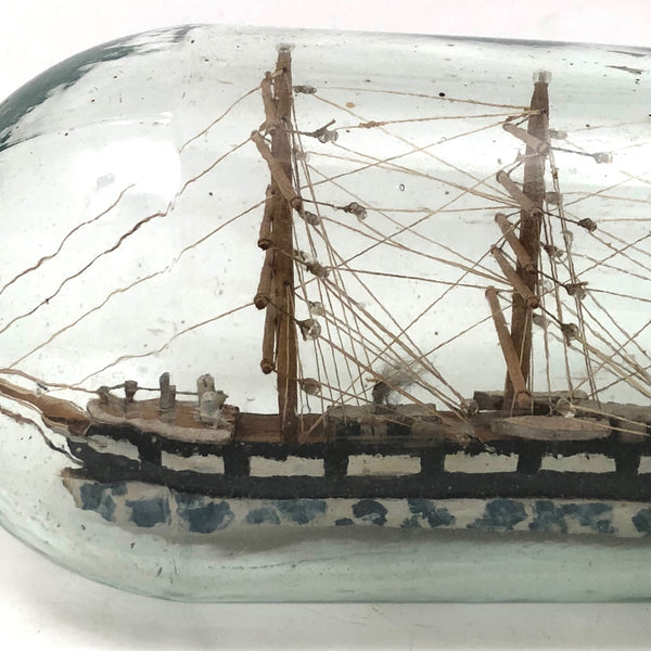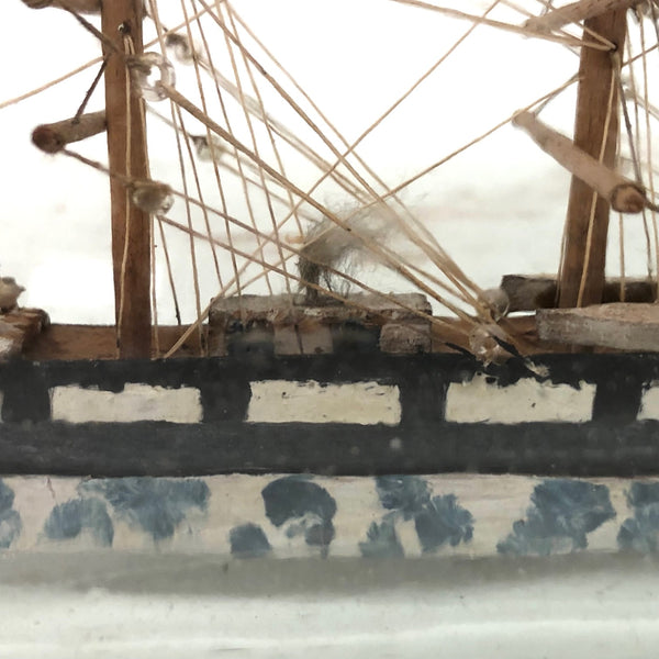 A real beauty of an old folk art ship in a bottle, which I found yesterday in New Hampshire and believe dates to the about the first decade of the 20th century. Wonderfully done, with four masts supporting a complex matrix of pulled thread lines, all still held taut, and then this fabulous paint job below, with graphic black and white for the hull, and then blue dabs on white for the sea it sails upon, looking like a sponge-painted pattern. Plus what looks like a little puff of smoke emanating from the top of the cabin near the center. Really a nice example, of the perfect size and scale, which would rest upright with a little museum wax underneath or of course set on a simple stand.