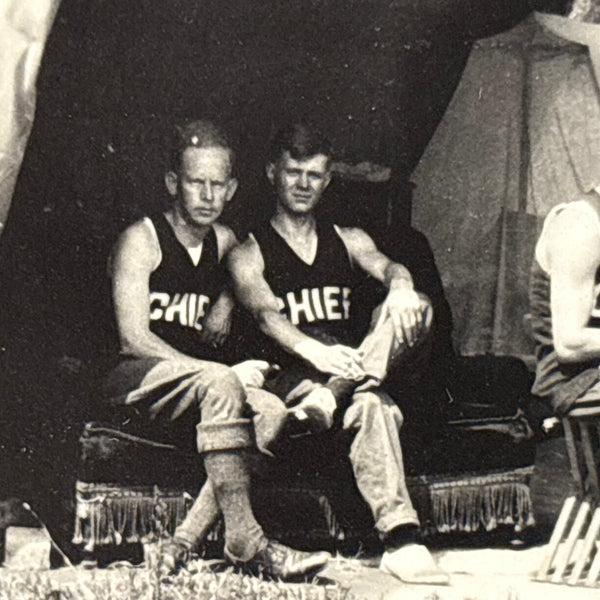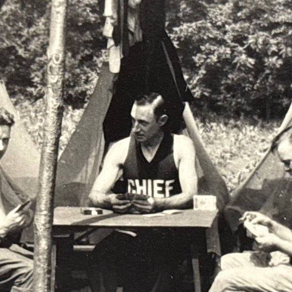 This one, and a second listed separately of the same gang, seem made for the moment - what a bunch of bros! I would guess those are team jerseys of some sort, but interesting that the Chief is singular--more as if Chief were a function (like Life Guard, or Senator!) than a team; so perhaps we have here a assembly of Chiefs of various domains, and perhaps the slightly older man at center, who looks to be the dealer of the cards, is the Chief Chief! (This feels so much like a metaphor for our moment to me.)