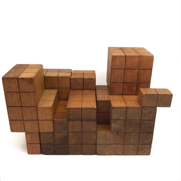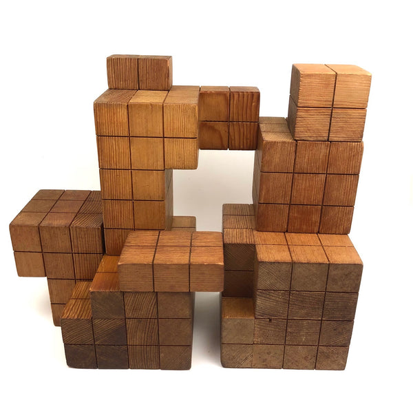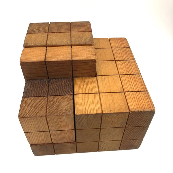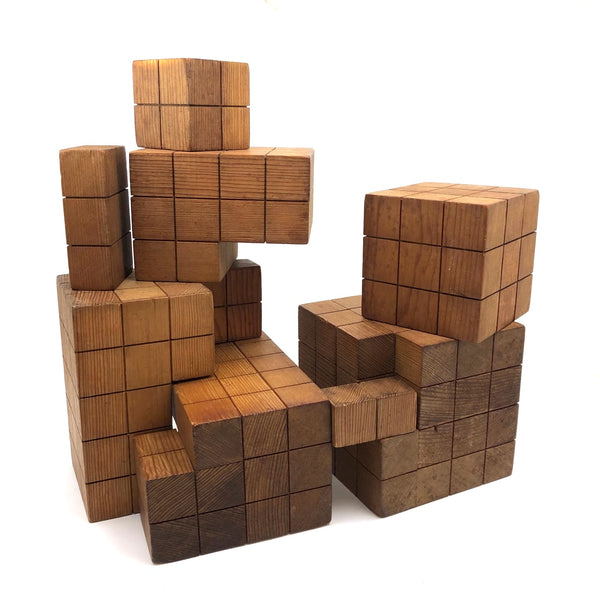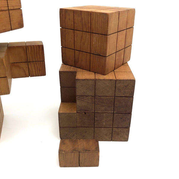 I can't find any others out there quite like these, but I'm pretty certain they were used as teaching tools for math many years ago, and they feel very much akin to old geometric solids and the like. I know for sure that I could spend many hours playing around with these, configuring them in different ways, and the large cube, divided in several parts, is very much a puzzling exercise to piece back together once taken apart. It also seems to me that, while they do configure into three cubes of progressive sizes, they are meant to be approached as a whole, with the smaller cubes treated as units that might be configured into something larger (i.e., I think ALL together might make one giant cube?) Tons of sculptural possibilities, and they make excellent pedestals for other things too. I'm guessing these are likely early 20th c. though they have a mid-c Danish modern sort of sensibility too. Fabulous.