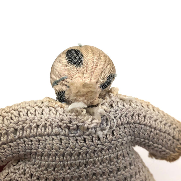 A charmer of a very little doll, except for the head completely executed in crochet, right down to those little booties. Lifting up her dress reveals pink legs and baby blue shorts, looking now as if tie-dyed and suggesting she was once more brightly colored.  Plus a fabric head, silk I believe, with much faded hand-drawn features and polka dots on the back where it is gathered, with a few stitches holding it to her head.  A tiny wonder.
