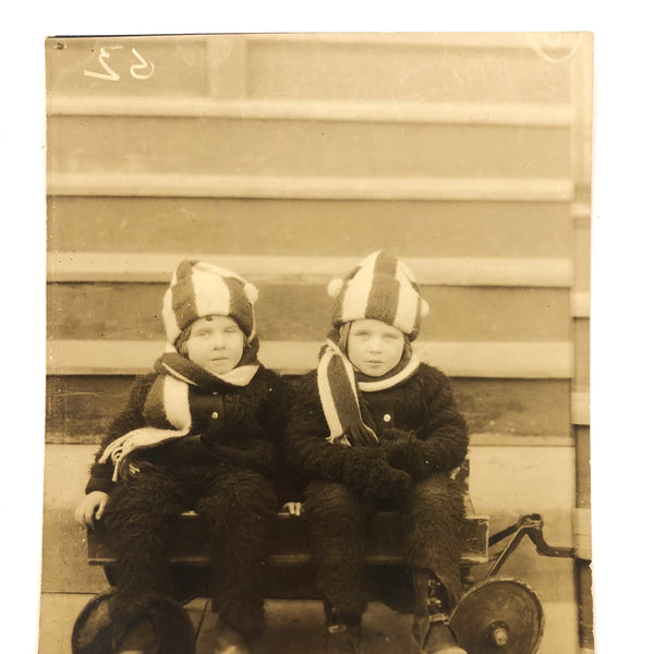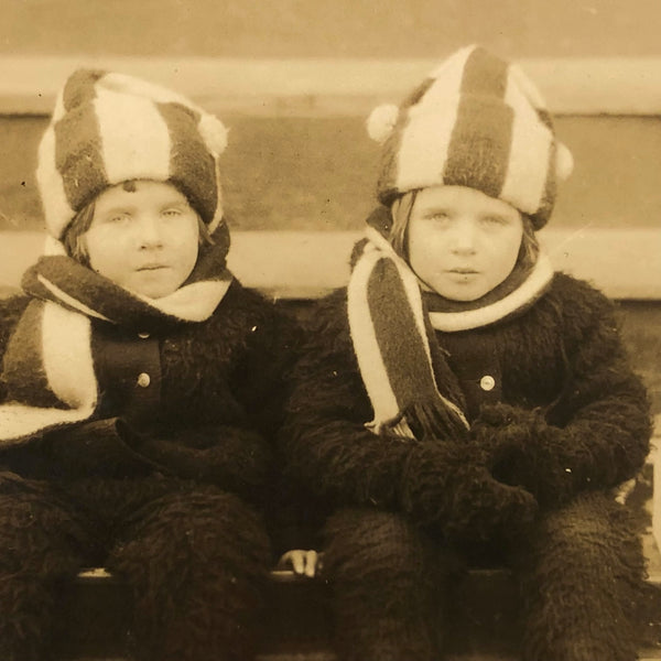 These two. Actually twins, or just sisters, we can't know for sure, but certainly twinned as far as the photo goes in their matching hats and scarves and wooly outfits. I especially like the formal rhyme between their stripes and the horizontal stripes of the stairs behind them, made all the better by the framing of the photo with wide margin below and thin strip of repeat of those stairs at far right.