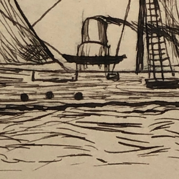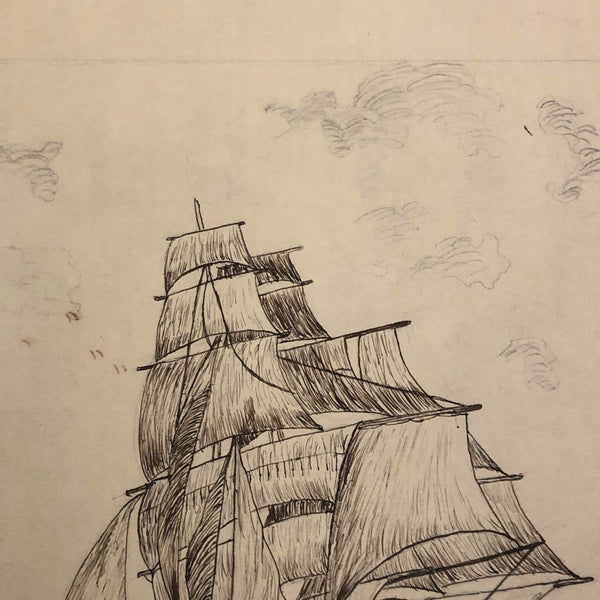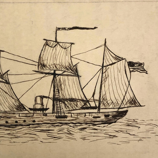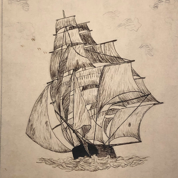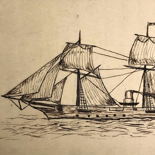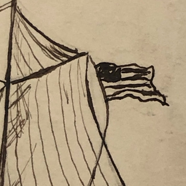 Smaller ship: paper size 8" x 10. Drawing: 5 5/16" x 3 5/8". This is the one which notes Boston and the date on the top of ledger page on reverse.