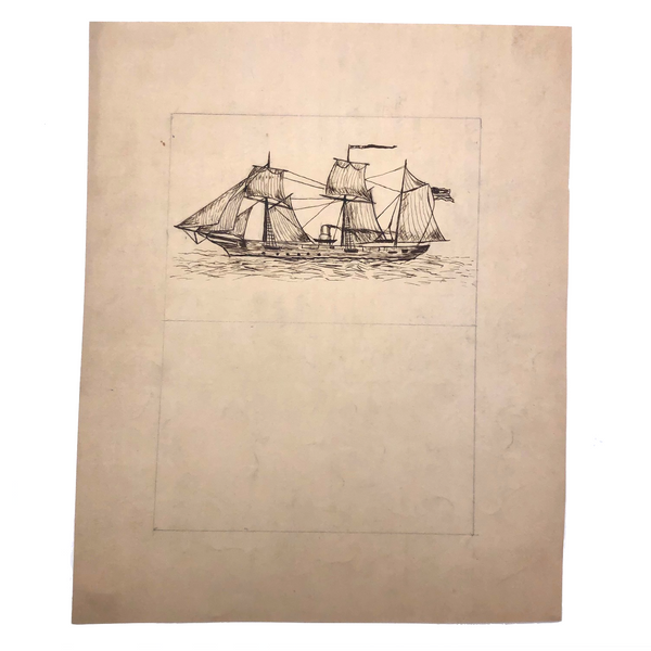 Larger ship: paper size is 9 x 7 1/2"; drawing is 6 3/4" x 5 5/16".