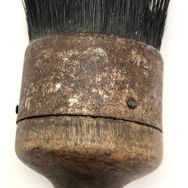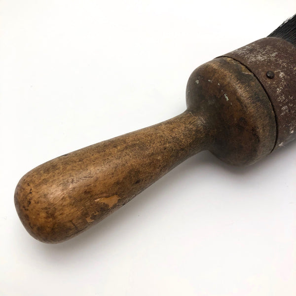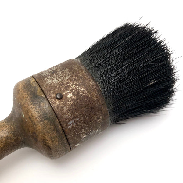 Another good old paintbrush, this one a stippling brush, with steel wrapped ferrule, nicely worn rounded handle, and natural bristles. Some rusting to the metal and a few flecks of old white paint on the bristles, bit overall great used condition and  many years of use in it yet.