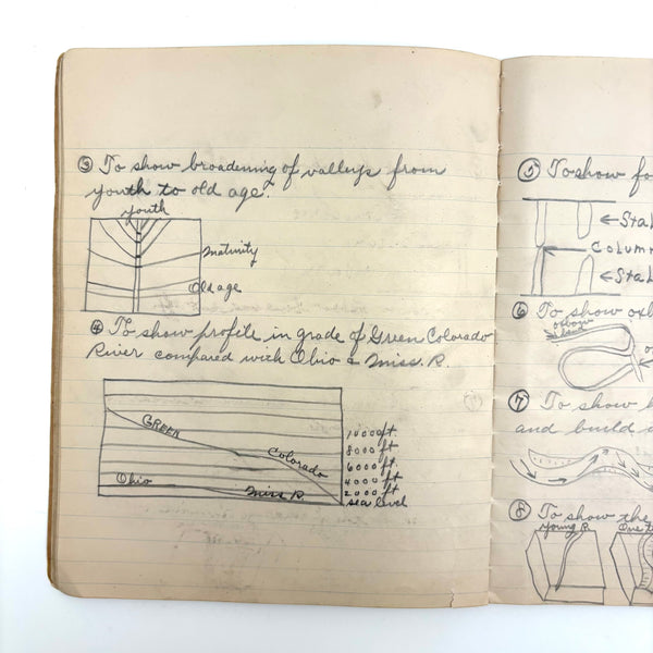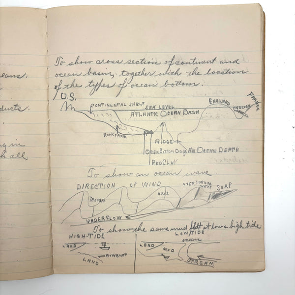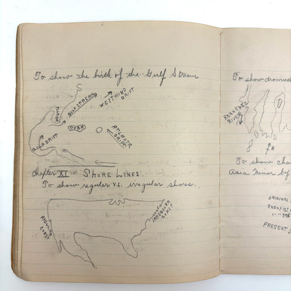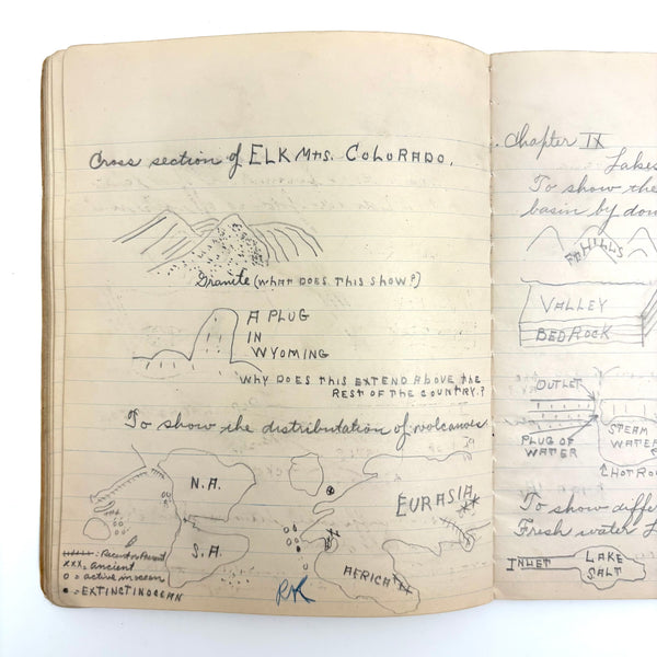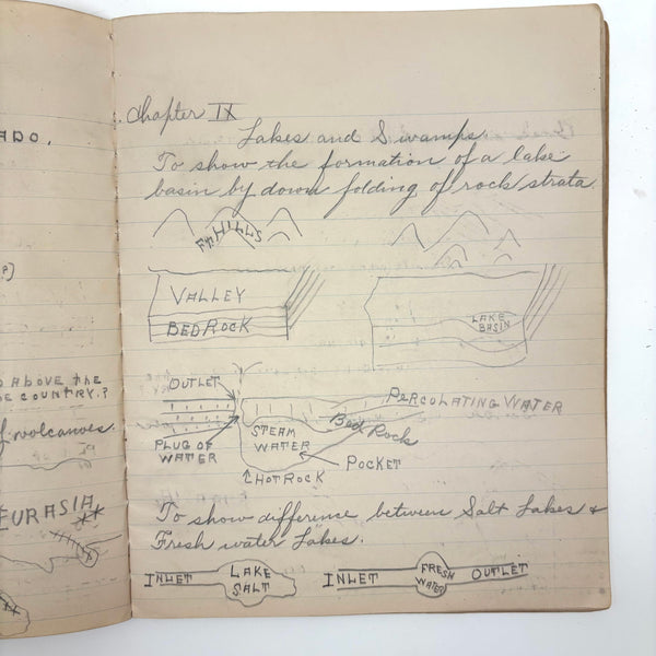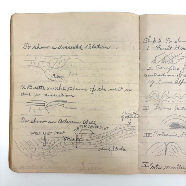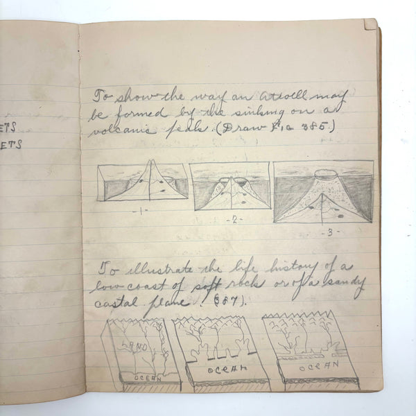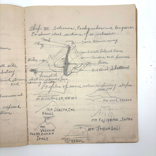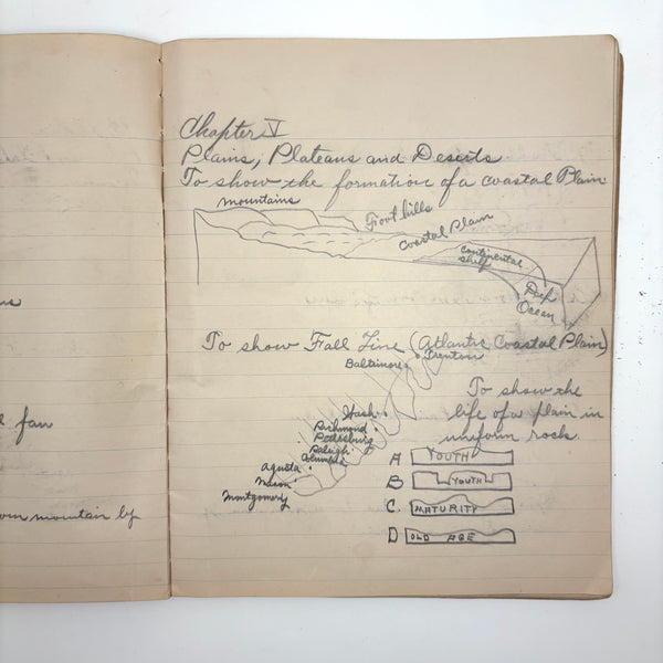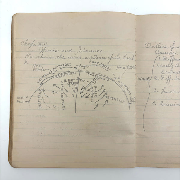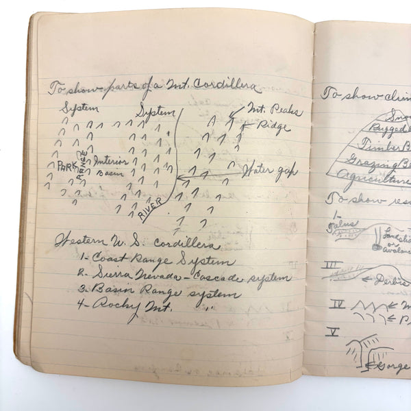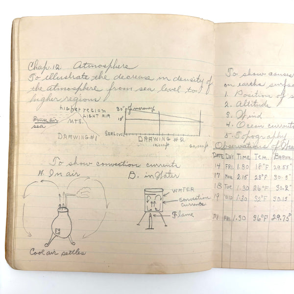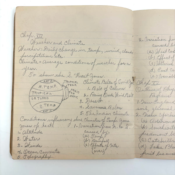 I purchased these two separately, but with the marble covered one filled just a portion of the way through (lots of blank pages to put to use now should one wish), I thought they'd be good to offer as a pair. Both are notebooks for Physiography classes--covering processes and patterns in the natural environment such as the atmosphere, hydrosphere, biosphere, and geosphere. (Facts!) Of course I'm always a sucker for the hand-drawn diagrams in notebooks like this, with lots of them here, as pictured. Photos give a good sense.