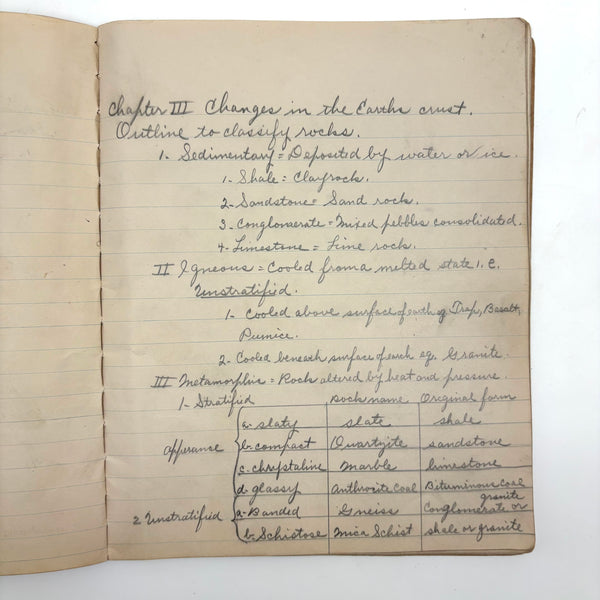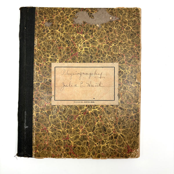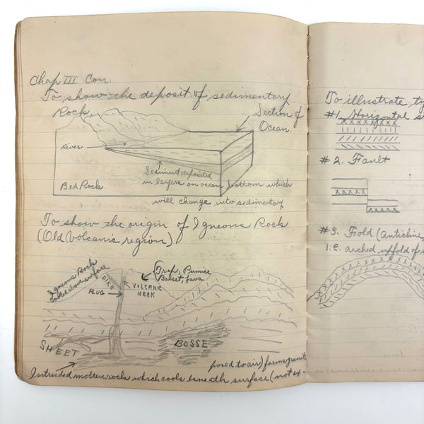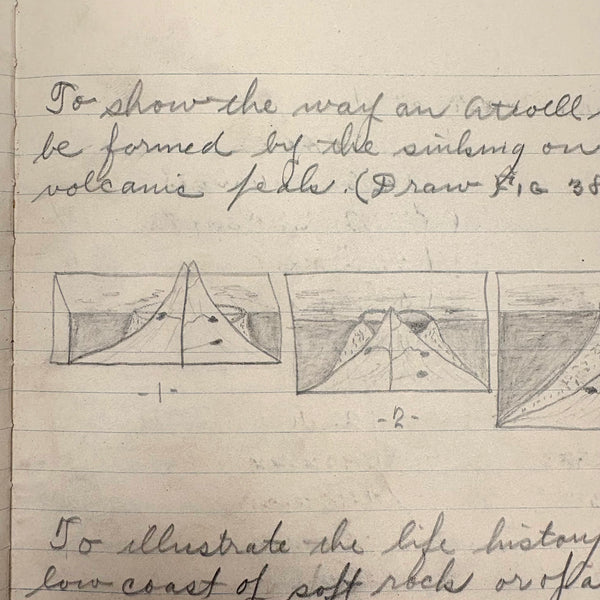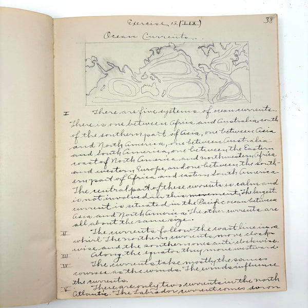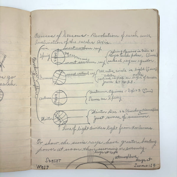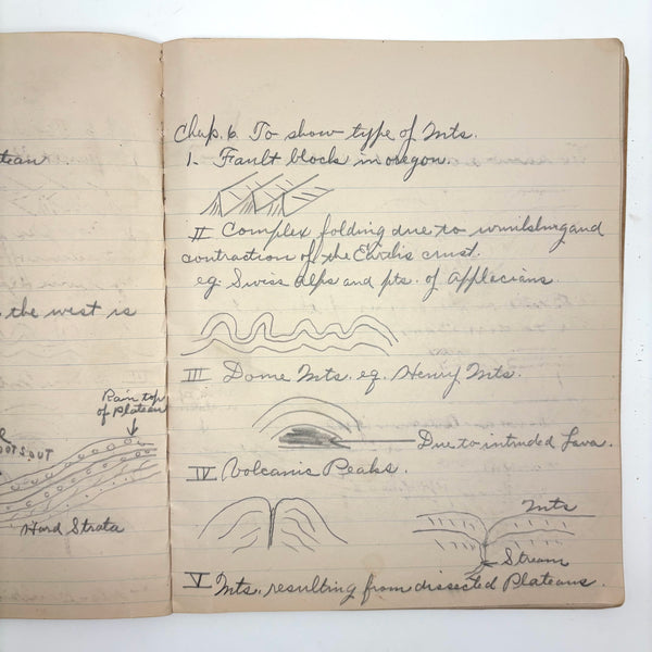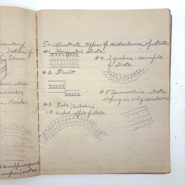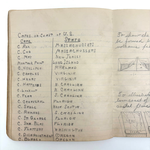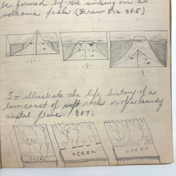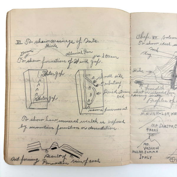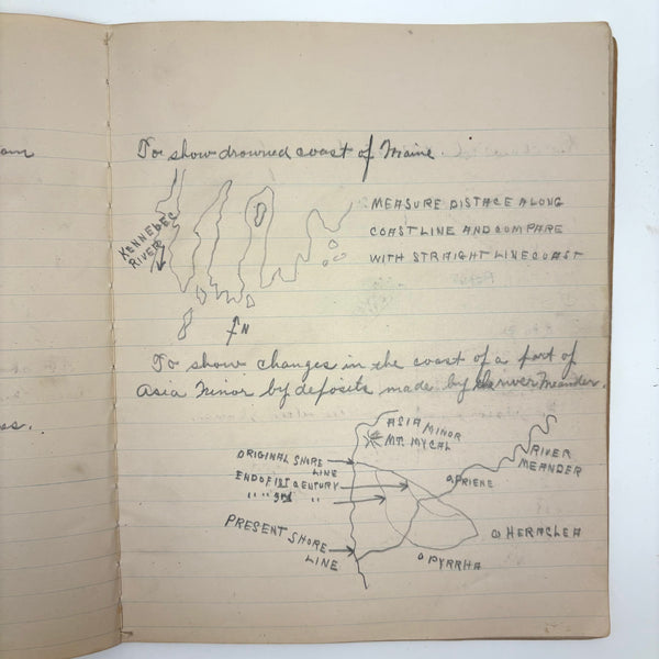 I purchased these two separately, but with the marble covered one filled just a portion of the way through (lots of blank pages to put to use now should one wish), I thought they'd be good to offer as a pair. Both are notebooks for Physiography classes--covering processes and patterns in the natural environment such as the atmosphere, hydrosphere, biosphere, and geosphere. (Facts!) Of course I'm always a sucker for the hand-drawn diagrams in notebooks like this, with lots of them here, as pictured. Photos give a good sense.