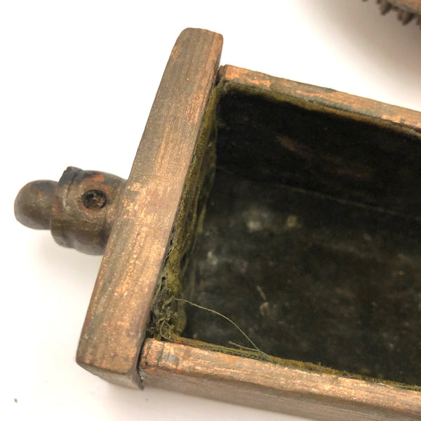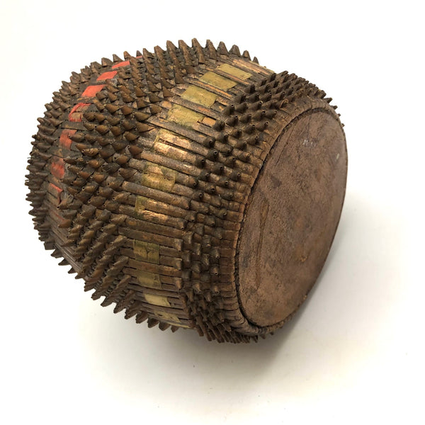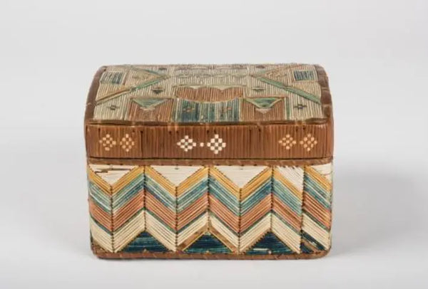 Altogether a beautifully unexpected object, at least to me, which feels relational to early Mi'kmaq quill decorated boxes (so amazing, one pictured) in terms of how the basketry covers the wood. I also really love the conversation it has with chip-carved cigar box wood tramp art pieces, as if to say "I'll do you one better. " And I would say it does!
