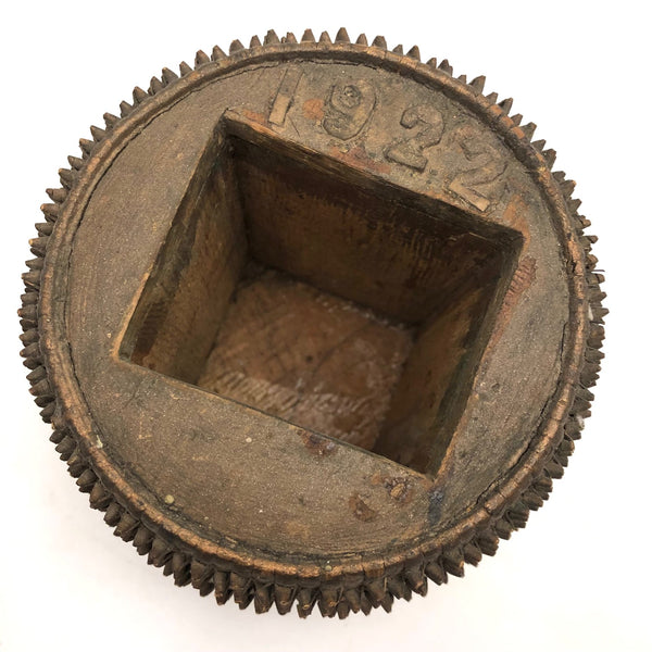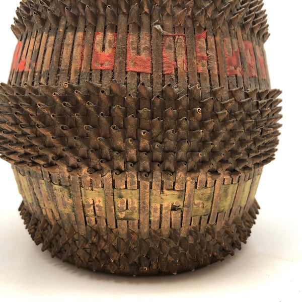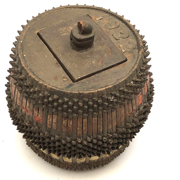6" tall x approx 5 1/2" widest diameter. 4" diameter at top and bottom. It looks as if some old loss likely to the end of the carved drawer pull, but I'm not entirely certain. No loss to the basketry at all, and not fragile, just a wonderful patina from 100+ years of life.