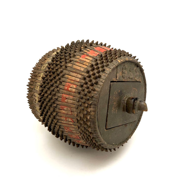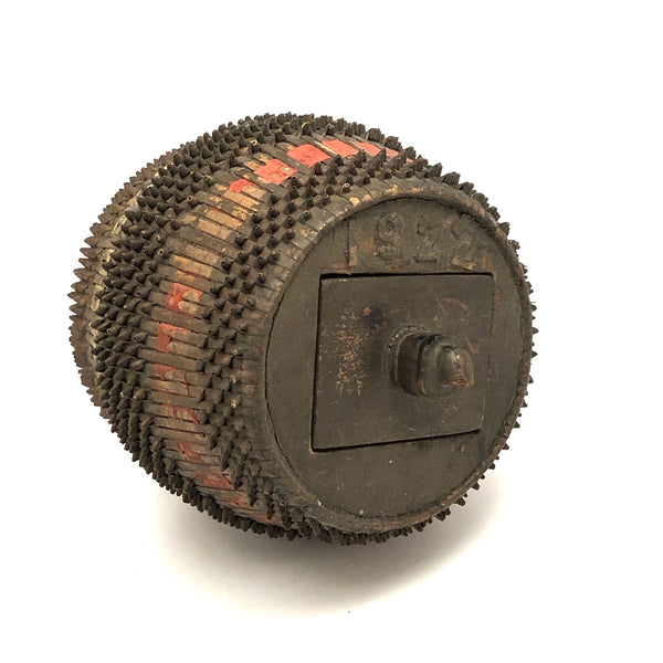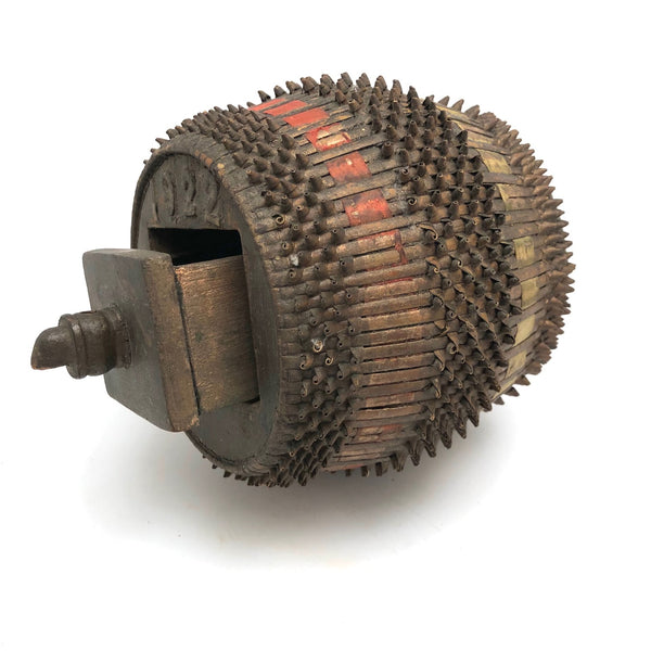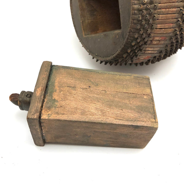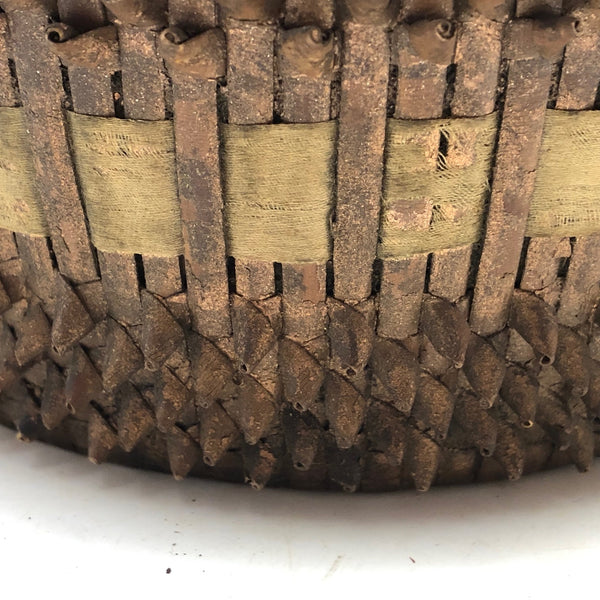 My most special find of the week, I think--a singular thing I've never quite seen the likes of, which I love for the fineness of the basketry, and for the folkiness of the the carving, and very much for the combination of the two in one object: a sort of Native American basket/tramp art box hybrid. I am confident it is either Mi'kmaq (I think most likely) or Passamaquoddy, both indigenous to Maine, with very fine "porcupine curl" pattern executed in ash splint characterizing the "fancy baskets" of both cultures. In this unusual case the basketry was executed over a carved wooden barrel form (which makes it heavy), giving it its shape and allowing for the carving out of a drawer and the carving of the year 1922 into the face of it. The drawer is lined in green velvet, and the wood painted a now much mellowed gold. Plus what looks to be red and yellow silk ribbon woven through though the warp of the splint to create colorful bands, with the splint itself painted gold in those areas, too.