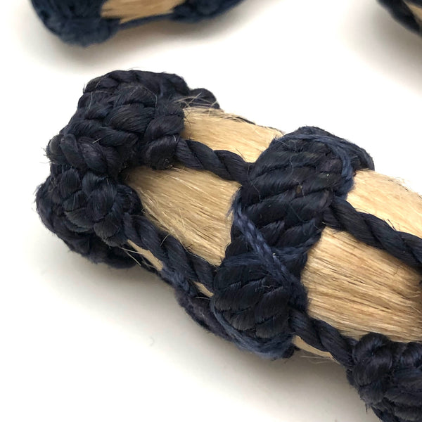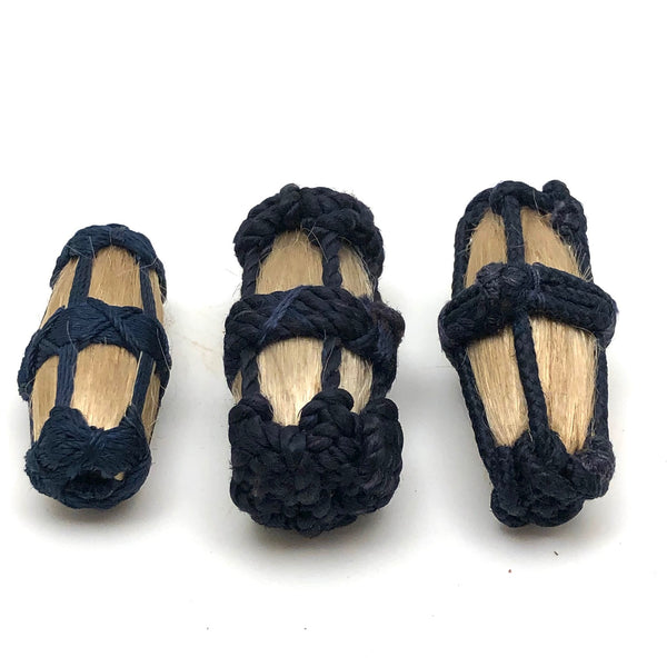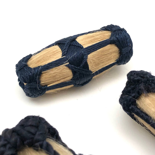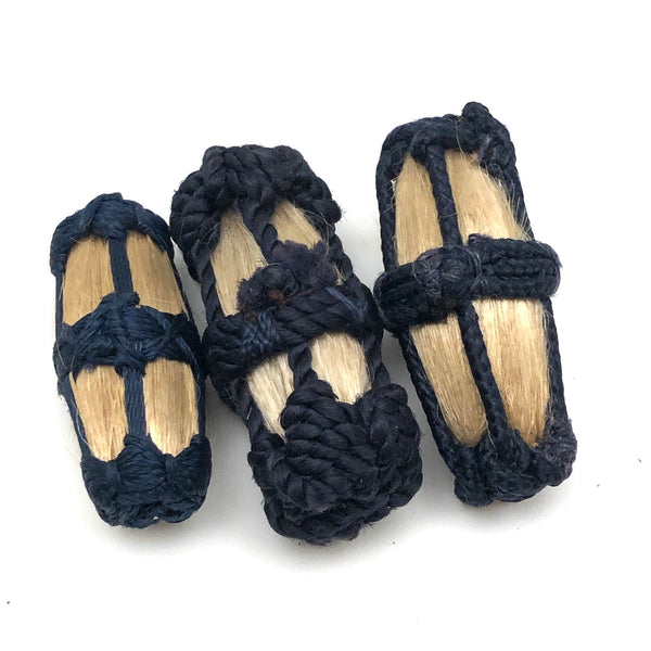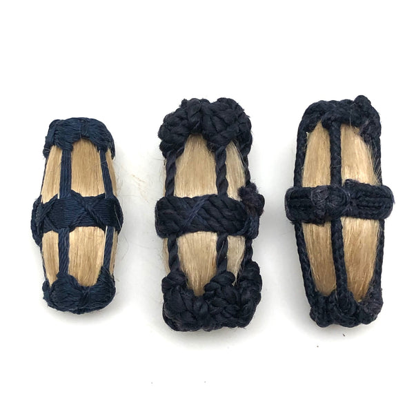 I've never seen the likes of these, which I believe are Victorian mourning buttons, made with blonde hair encased in finely wrapped and knotted blue cord and thread, silk I believe. One presumes these were made to be sewn to a garment--perhaps like toggles on a shawl or coat--but I'm not entirely sure. Whatever the case, quite unusual as far as I know, and feeling like literal capsules of another time (and specific person!), which could easily be strung by their "casings" now.