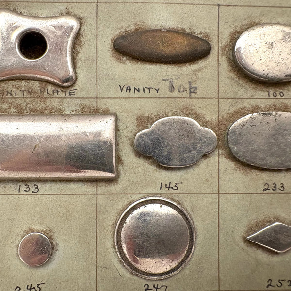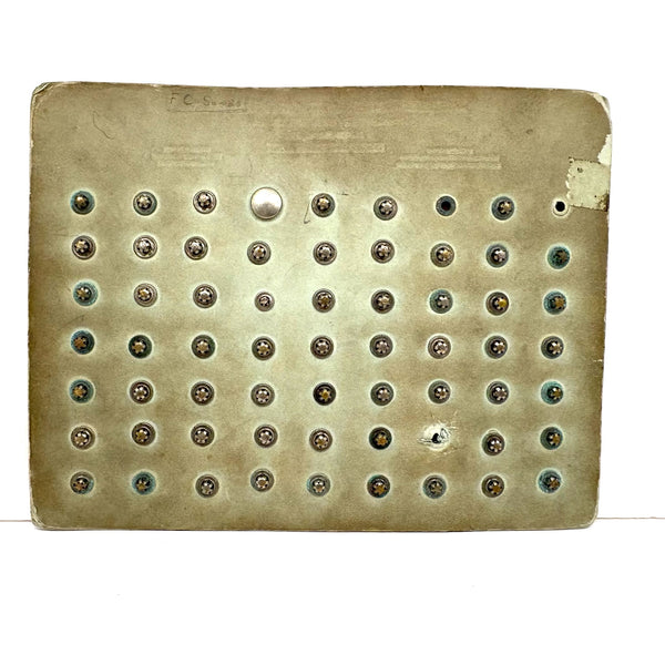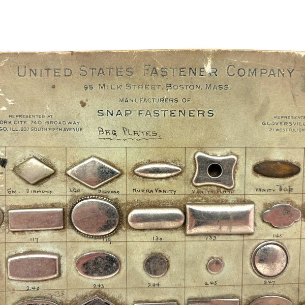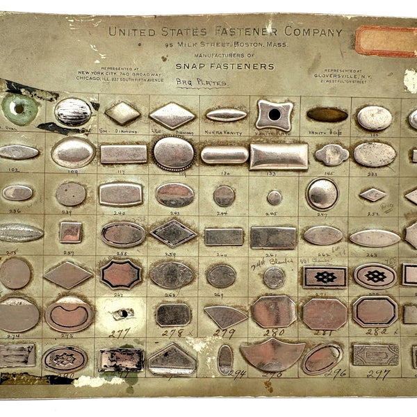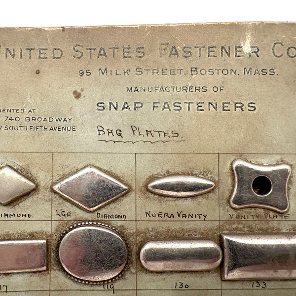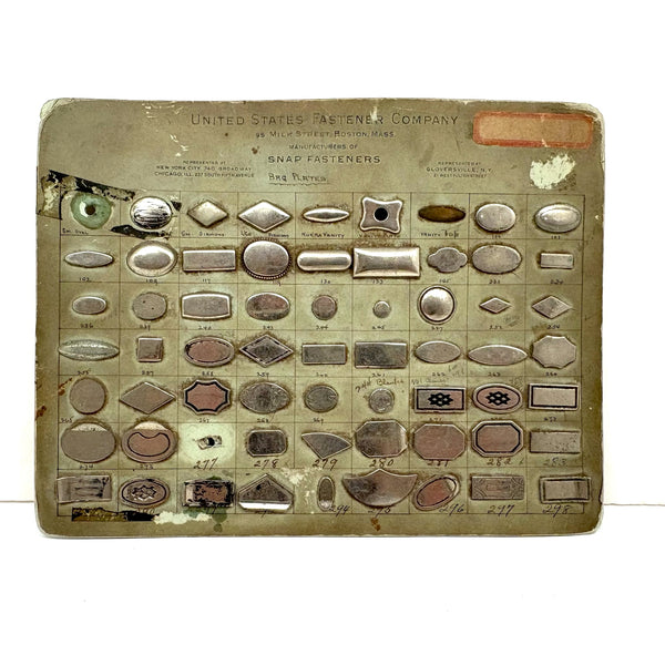 This one is heavy with the weight of all these metal "bag plates"--I believe snap closures for the flap of a purse or the like. I just love old sample cards like this, especially much handled ones with handwritten numbers and notes on them. This one was produced by the United States Fastener Company located on Milk Street in Boston--whose work clearly involved holding all sorts of things together! c. 1920s-40s I believe, with a very satisfying reverse side too.