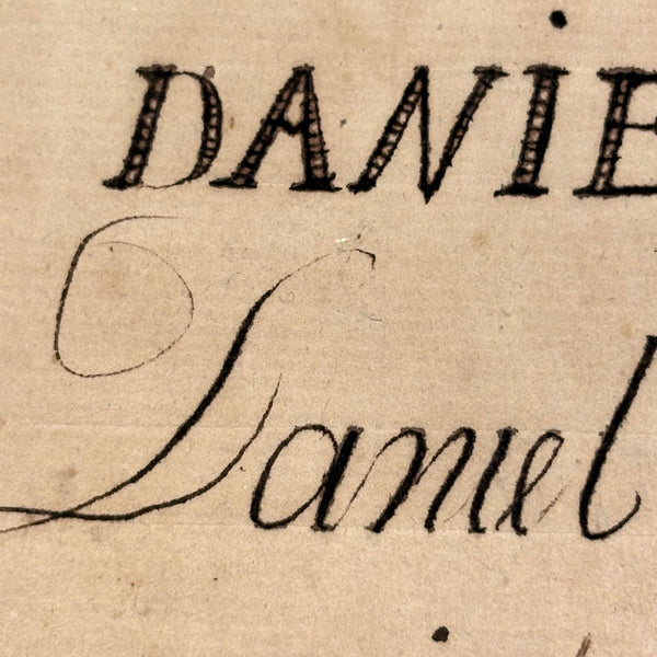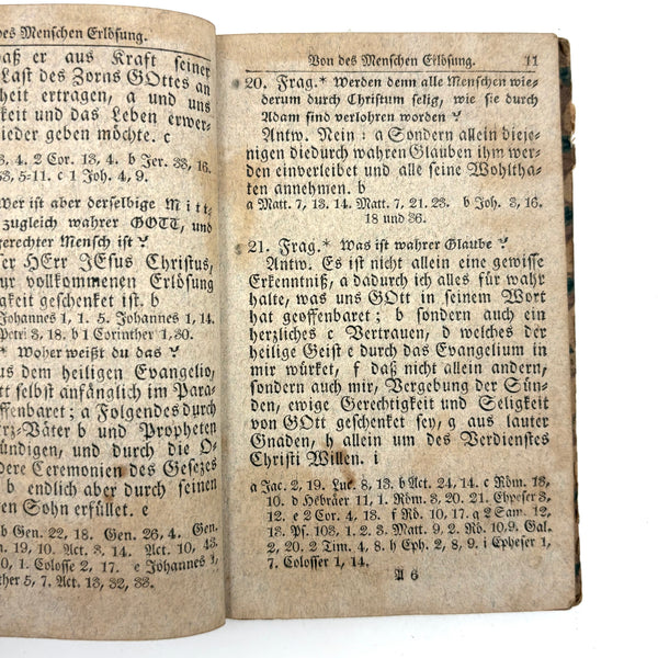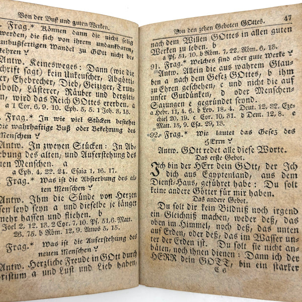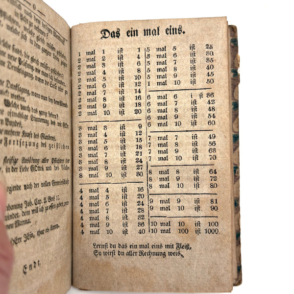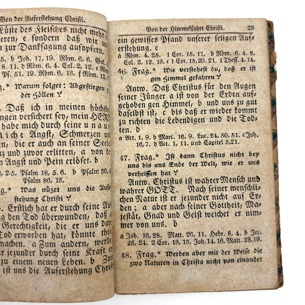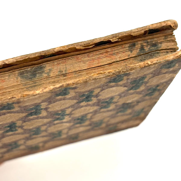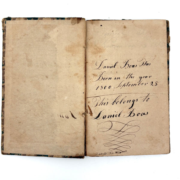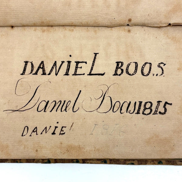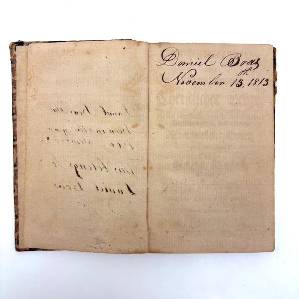 This, and a second PA German catechism book listed next, are all about book as object for me--namely about the gorgeous hand-printed paper on the cover-boards, and, in the case of this one, about the ink lettering on the endpages. On this one the long edges of the pages were painted, too. I simply do not have it in me not at least temporarily take stewardship of books like this. The book was published in Reading PA in 1811, and the Daniel Boos who owned, born in the year 1800, inked his name inside at both ends, in 1815.