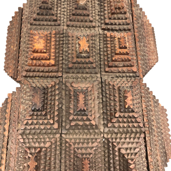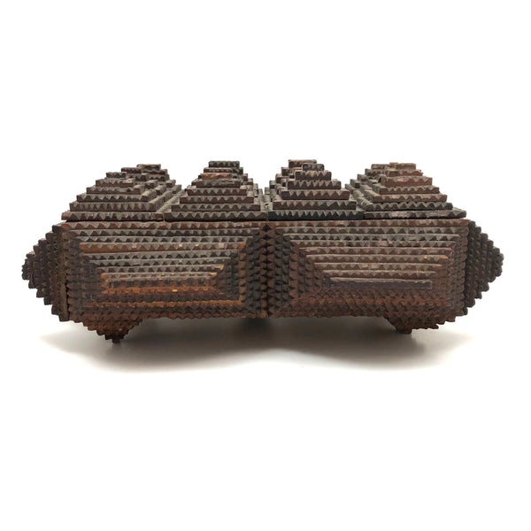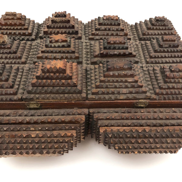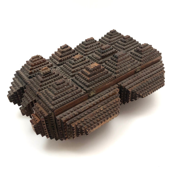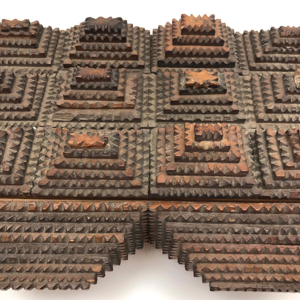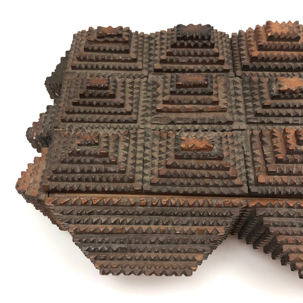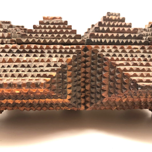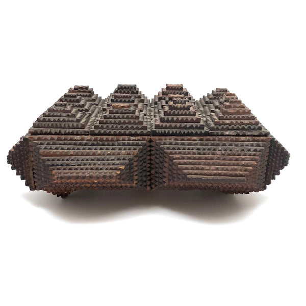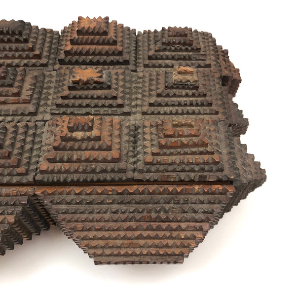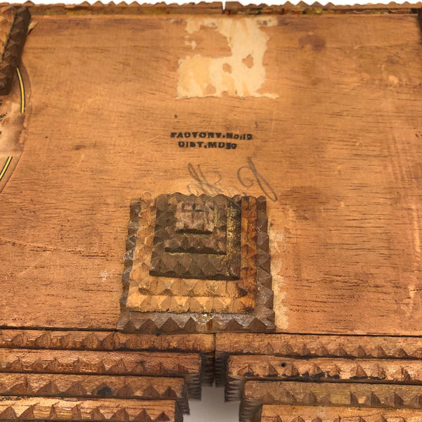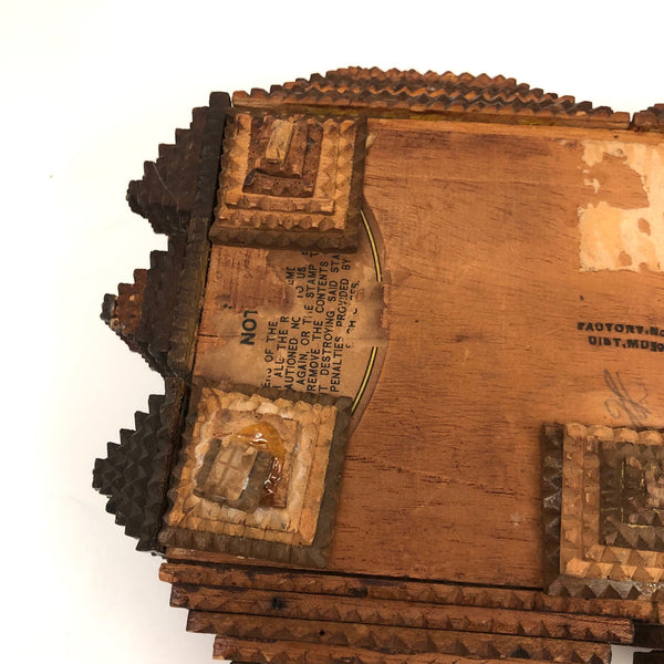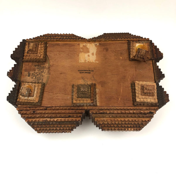I'm always thrilled to find a super sculptural tramp art box, just of this sort, and this one with a fantastic pattern of 12 stacked squares on the hinged lid. It's quite finely done, really almost delicate (though not fragile) -- just over 11 inches across, meaning that all those many many chip carved bits are small in scale and were very precisely laid. Beautiful all the way around with no notable losses, with the exception being the center front foot on the underside--which is a positive loss I think, not affecting its stability but making for an even better view from the front. And inside, an orange velvet lining, and, fittingly, "Golden Seal" printed on the cigar box lid. Really a nice one!