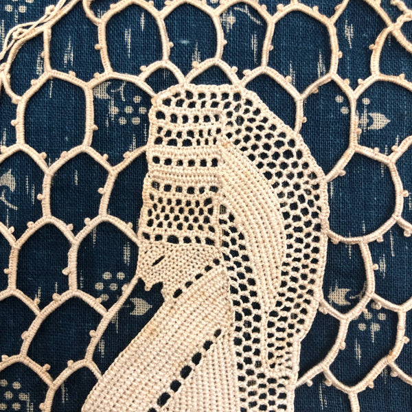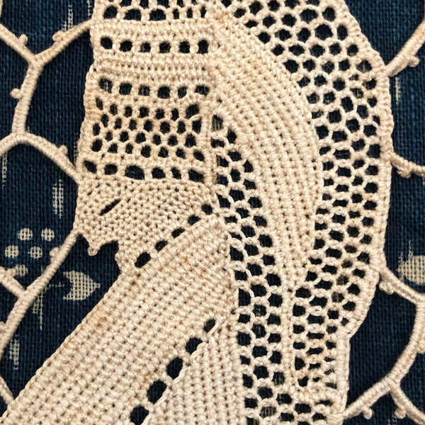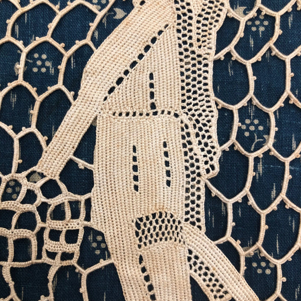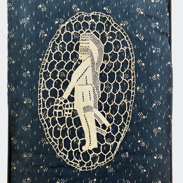 The fabric it is floated on, inside an archival glass-fronted box/frame, is I believe a late 19th c American printed indigo--which is how I found it. The lace, made of cotton I believe, measures 7 5/8" x 4 5/8" and is in great condition, not at all fragile condition, with a little minor staining/browning here and there. The box frame measures 14 5/8" x 8 1/16" x 1.