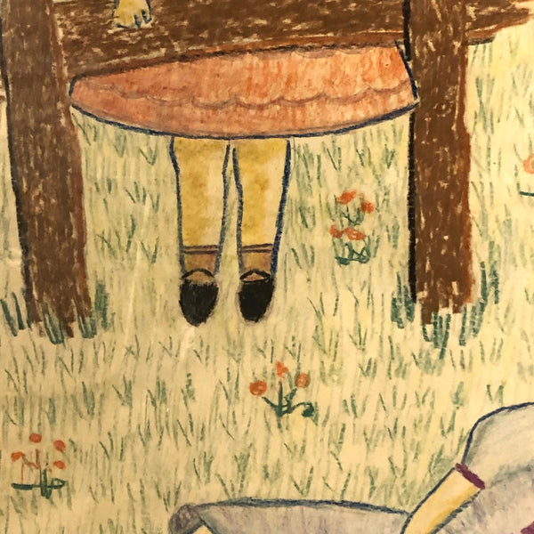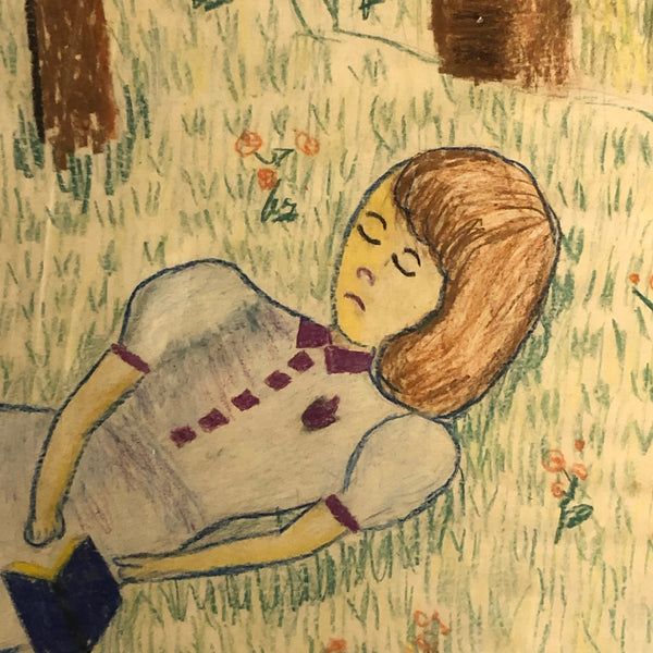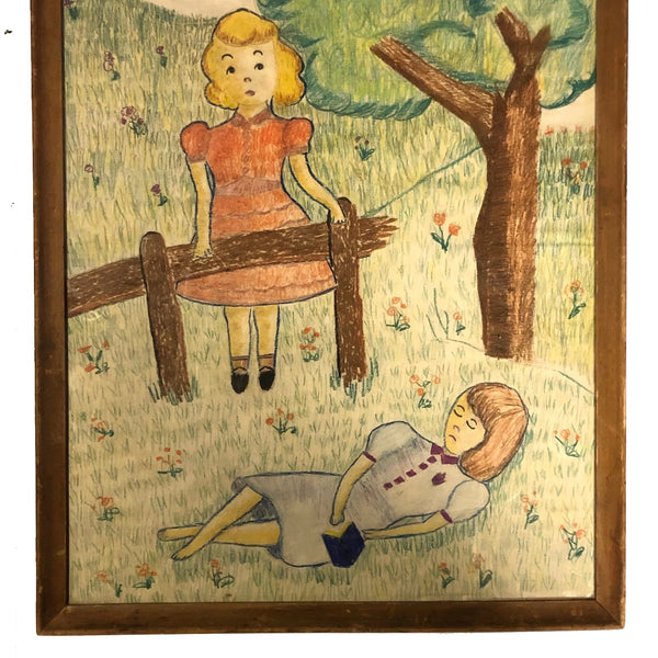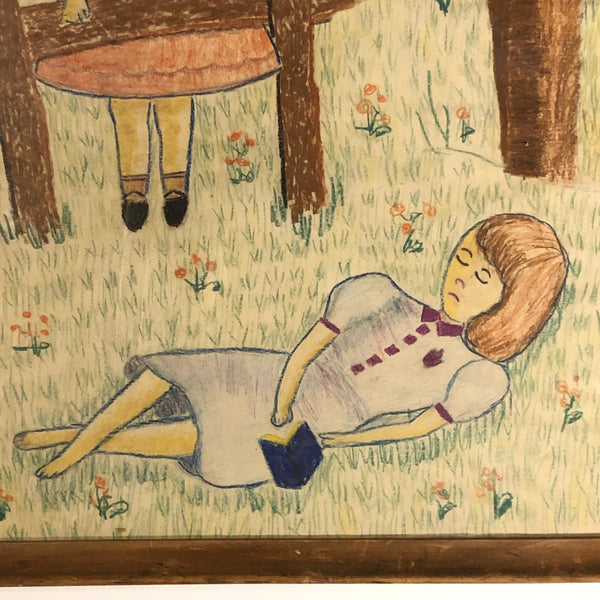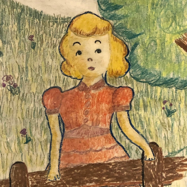 It's the face on the girl in the foreground that really sold me on this one, looking as if her book has put her to sleep, but also making her look a bit moody, in contrast to the curious girl in pink dress standing at the fence. I like the punctuation of the grass with little flowers everywhere, too, and the cloud like puff of leafy green tree at right. Whether done by a teacher or a student I'm not sure, but a good one to hang in a kid's room now I'd say, or next to one's reading chair!