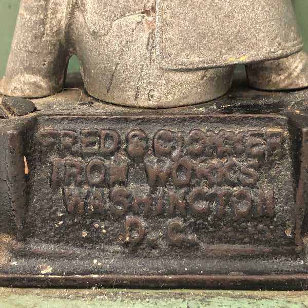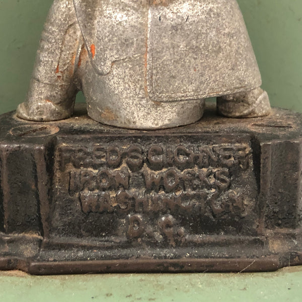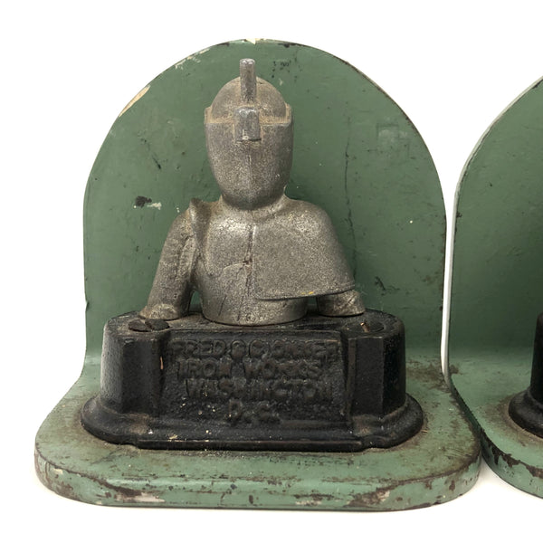I believe these likely date to the 1930s-40s or so, and can find no other pair out there like them. Terrific combo of silver knight against that green paint, and each stamped Fred S. Gicher Ironworks Washington D.C. just below the knight.